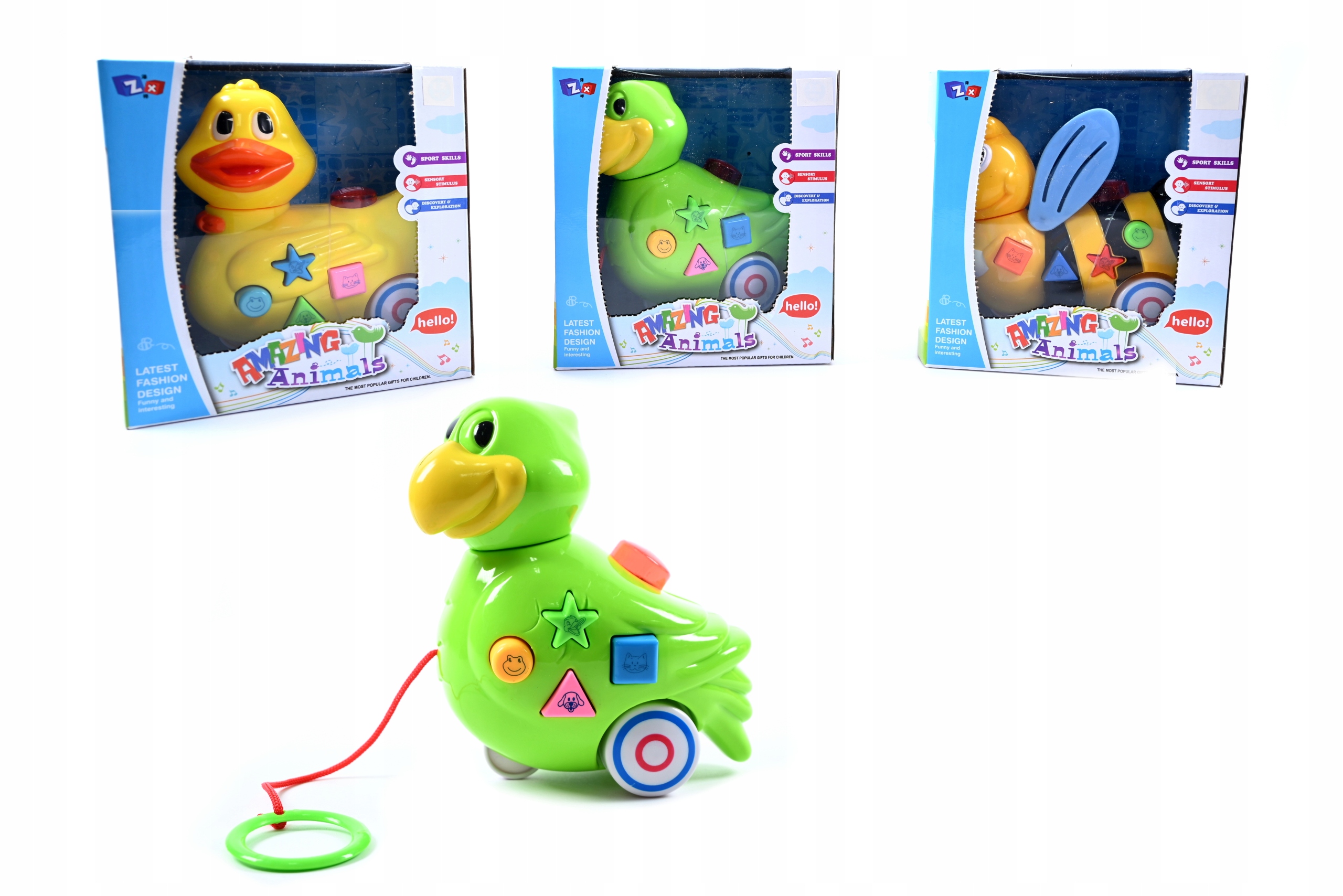 Іграшка доступна в трьох милих варіантах: зелена пташка, жовта качечка або помаранчева істота. Кожна іграшка має унікальні навчальні елементи та характерний дизайн.