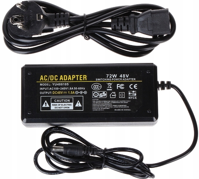 Максимальний вихідний струм1,5 AВихідна напруга48 В постійного струмуВхідна напруга100 В ... 240 В ACOВихідна потужністьмакс. 72 Вт Роз’ємШтекер 2,1/5,5 мм на кабеліІндикаторні діодиБез корпусу Пластик Робоча температура / відносна вологість0 ... 55 °C / 10 ... 90%Вага0,24 кгРозміри125 x 55 x 32 ммГарантія2 роки