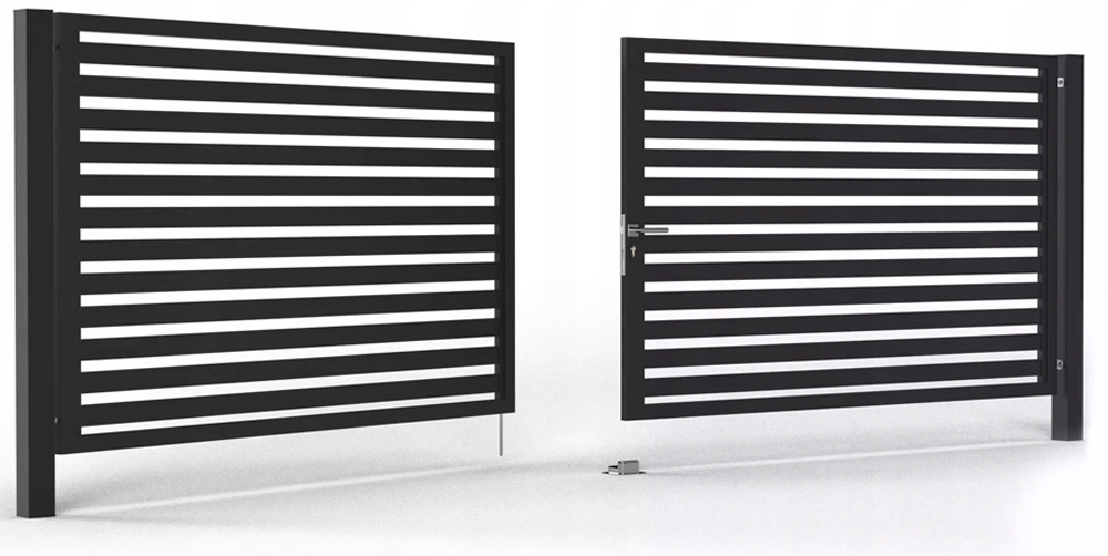 Хвіртка БР.11.3.2 Каркас хвіртки виготовляється з профілів 60×40 мм. Наповнення воріт являє собою профіль 80×20 мм, розміщений з інтервалом 4 см, можливе вставлення різних колірних поєднань наповнення. Монтажні стовпи включені. Ворота укомплектовані замком, циліндром, ключем, ручкою, петлями, штангами та засувом.
