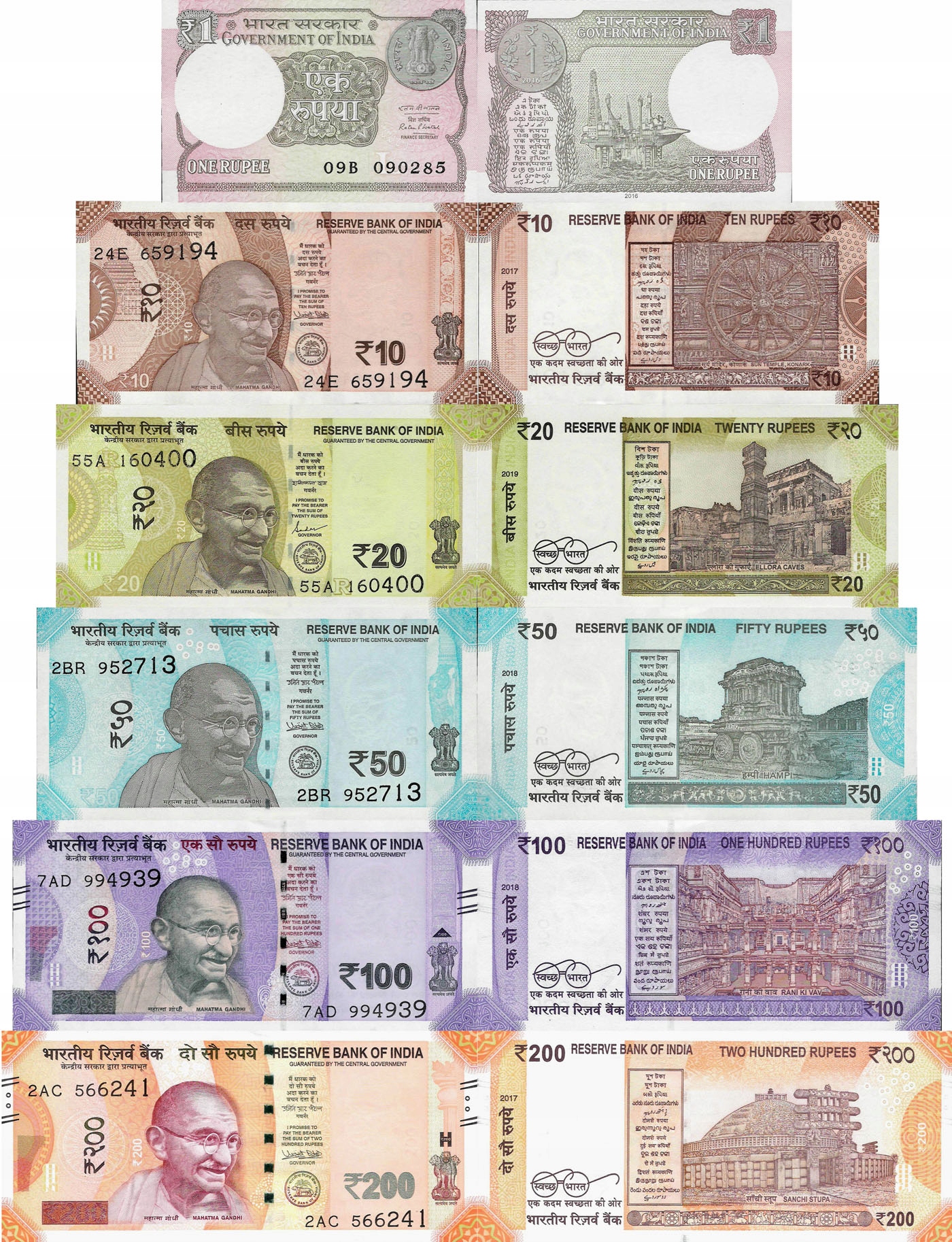Indie zestaw 1+10+20+50+100+200 Rupee P109-117 UNC