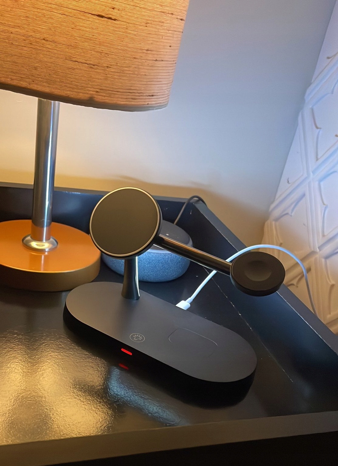 Зарядна станція 4 в 1 забезпечує швидку індукційну зарядку iPhone, Apple Watch і AirPods. Крім того, він має вихід USB з можливістю зарядки будь-якої техніки. Простий, мінімалістичний дизайн ідеально підходить для будь-якого інтер'єру та ідеально поєднується з пристроями Apple. Він призначений для швидкої зарядки новітніх смартфонів Apple, оснащених системоюMagSafe. Зарядний пристрій має роз’єм MagSafe для заряджання iPhone, магнітний роз’єм Apple Watch, зарядний пристрій Qi для Apple AirPods і порт USB.