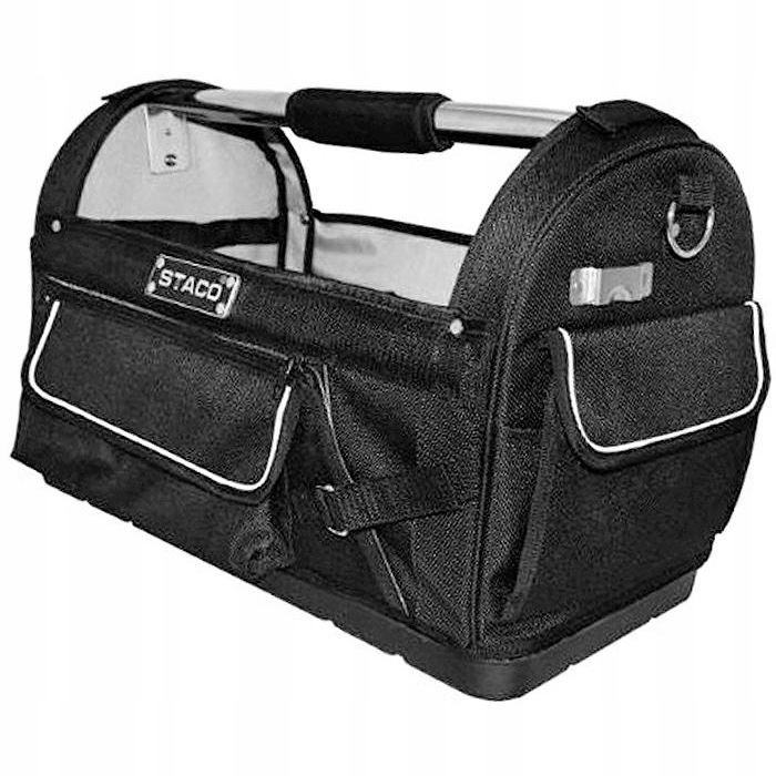 Сумка для інструментів, підкріплена діагоналі 18 дюймів і розмірів: 470 х 250 х 320 мм. Виготовлений із спеціальної тканини з підвищеним імунітетом, додатково підсиленим пластиковим корпусом. Оснащений міцною металевою ручкою з м’якою ручкою та регульованим ремінцем для полегшення руху сумки. Для того, щоб функціонально розповсюдити інструменти, сумка була озброєна 15 практичними кишенями різних розмірів, для викруток, кліщів, зубилів, файлів та багато іншого. Особливо примітно, є два ремінці, закріплені липучкою для фіксації рівня рівня та спеціальної кишені для ручної пилки з смужками, що захищають від нього. Крім того, ряд практичних бічних кишень, що відкриваються або закріплені на липучках, також вирішують про ємність сумки.
