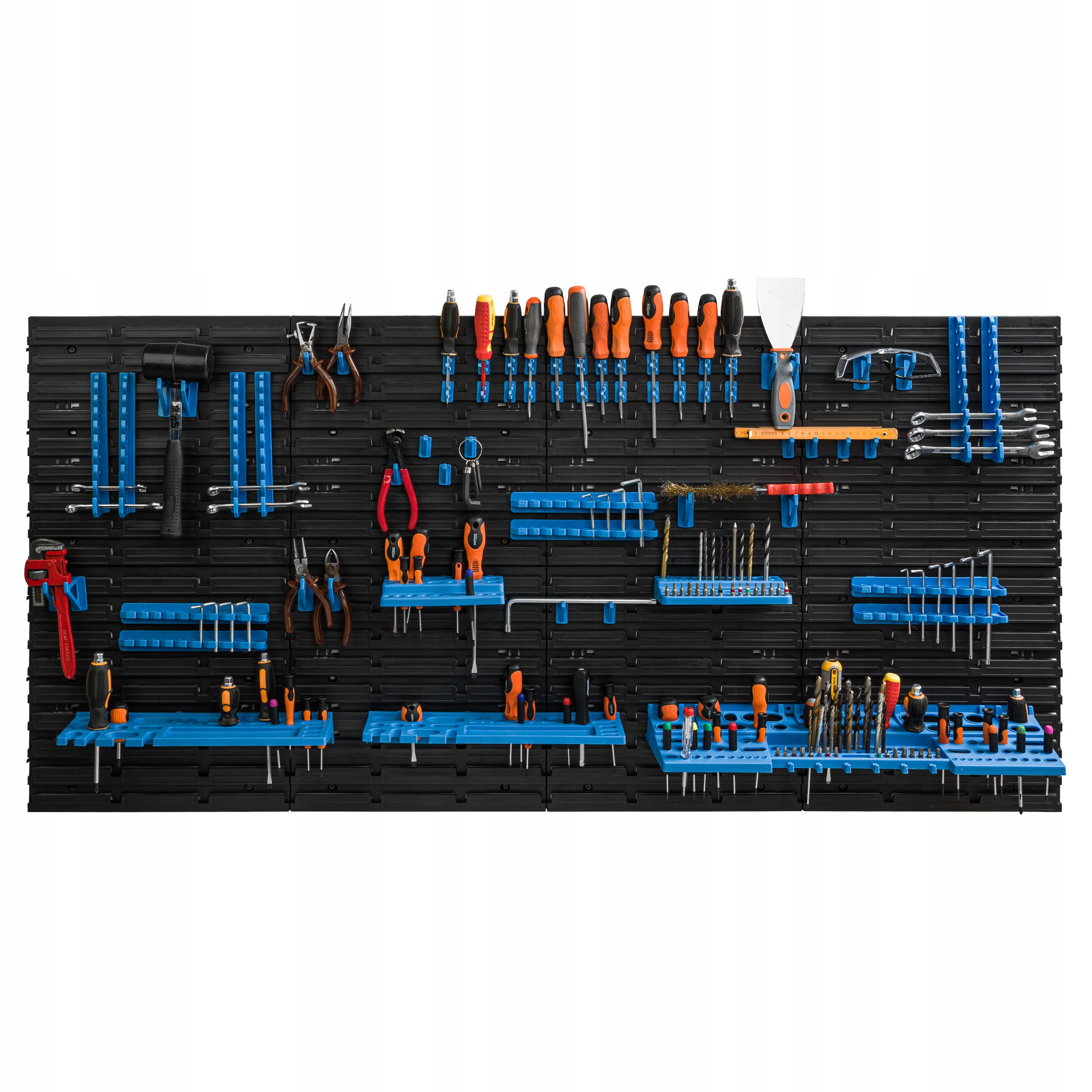- Набори тримачів: У комплекті: Полиця для інструментів 580 x 158 x 67 мм , 2 полиці для інструментів 384 x 111 x 50 мм, полиця для інструментів 190 x 111 x 32 мм, полиця для ящика для інструментів 180 x 111 x 32 мм, 12 тримачів для ключів (6 вертикальних, 6 горизонтальних), 24 тримачі для викруток, дрібні інструменти, 12 5,5 шт. вішалки см, 12 вішалок 3,5 см.