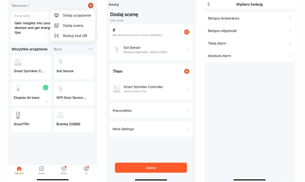 Датчик вологості ґрунту та температури дозволяє створювати розширену автоматизаціюза допомогою інших пристроїв із екосистеми Tuya/Smart Life . Щоб почати, натисніть значок "+" у верхньому правому куті програми, а потім виберіть "Додати сцену", після чого ви перейдете до налаштувань. Сцена — це автоматична дія, яка запускається сама залежно від вибраних умов, що забезпечує повну автоматизацію.