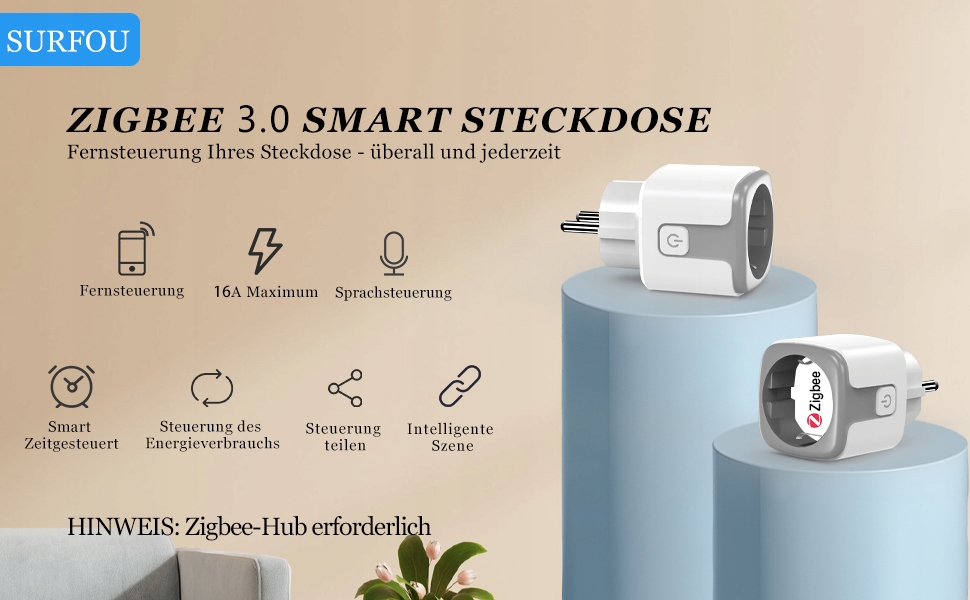 Смартна розетка Zigbee підходить лише для WiFi 2,4 ГГц (не 5 ГГц). Розетка Wi -Fi Zigbee вимагає точного налаштування. Розетка Surfou Zigbee Wlan Plug працює з усіма концентраторами Zigbee (Gateway), але не містить "HomeKit" та "Матеріал". Використовуйте електричну розетку з макс. 3680 століття.