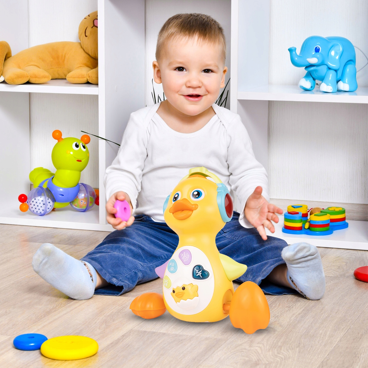 чарівний, грати в качку буде ідеальною іграшкою для малюка з 18 місяців. Наша тварина видає багато цікавих звуків та веселої мелодії , що, безумовно, сприятиме задоволенням. Крім того, Кацузька може рухатися на рівній поверхні, весело розгойдуючись до ритму музики. Все задоволення супроводжується барвистими вогнями розміщеними на навушниках. Барвисті кнопки в передній частині іграшок дозволяють вмикати різні цікаві звуки, веселі мелодії та звуки.
