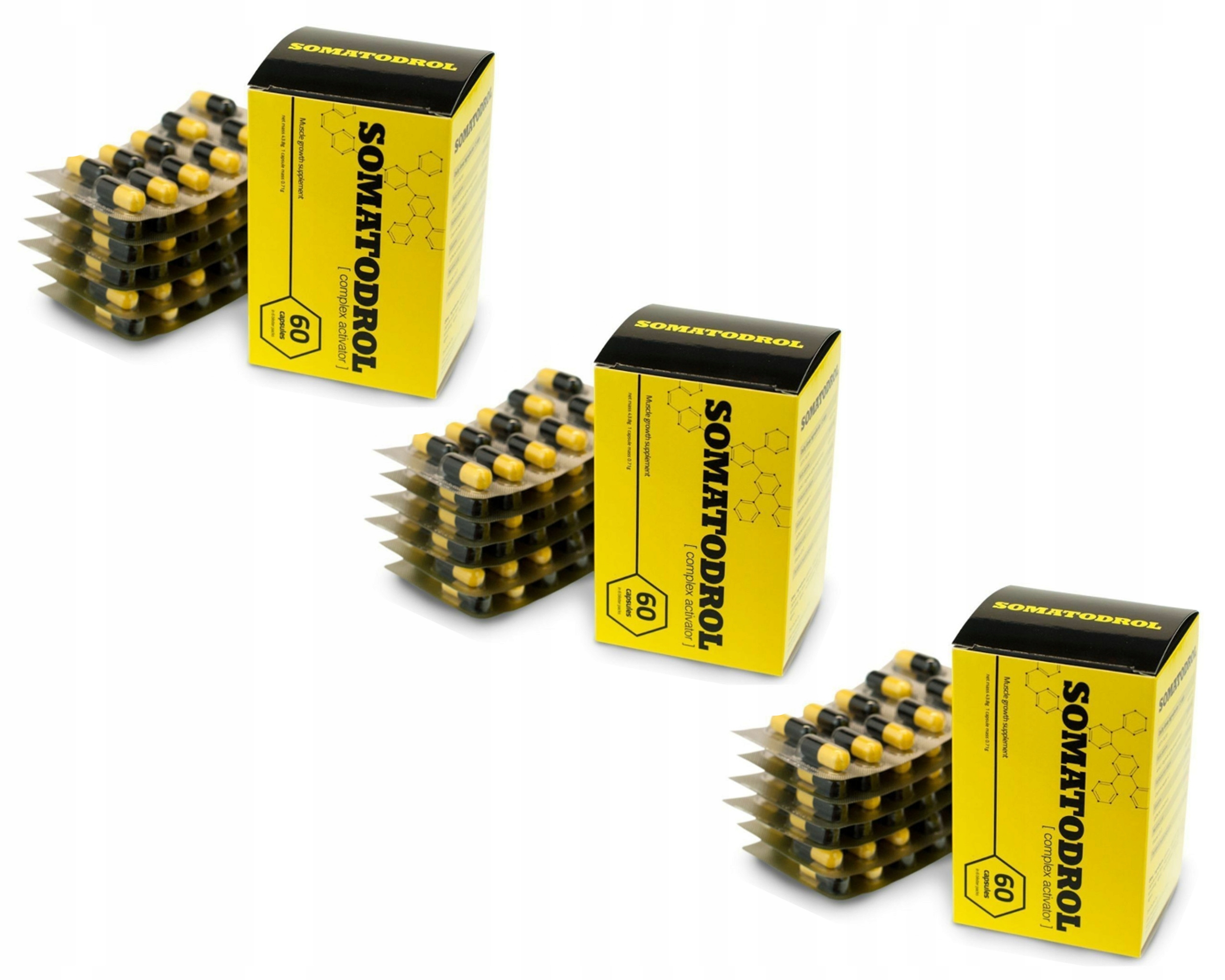 SOMATODROL - це дієтична добавка, яка сприяє збільшенню м'язової маси, основним інгредієнтом якої є спеціальна формула GRTH Factor. Його рецептом є бета-аланін і аргінін, поєднані в унікальних пропорціях, щоб гарантувати найкращі результати. Ця формула відповідає за підвищення вироблення тестостерону і гормону росту, прискорює ріст м'язів, регенерацію організму після фізичних навантажень і забезпечує енергією, необхідною для наступної серії вправ. Інші інгредієнти добавки включають: Кайенський перець, гуарана та вітамін B12.