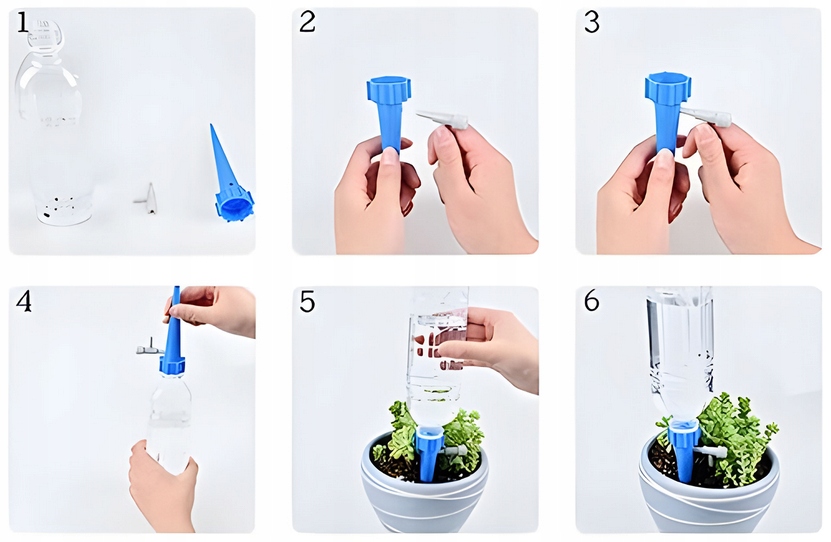 Ви їдете у відпустку, і у вас немає кому довіти нам квітів? Цей автоматичний пристрій для поливу може допомогти вирішити вашу проблему. Для використання в спекотні дні та для всіх -річних домашніх використання для зручності поливу. Ви також можете додати у воду рідке добриво для автоматичного запліднення. Ми рекомендуємо використовувати пляшки потужністю 500 мл до максимуму 1,5 л. Пристрій для поливів з контрольним клапаном можна керувати швидкості капання (швидкість крапельки залежить від кількості води в пляшці).