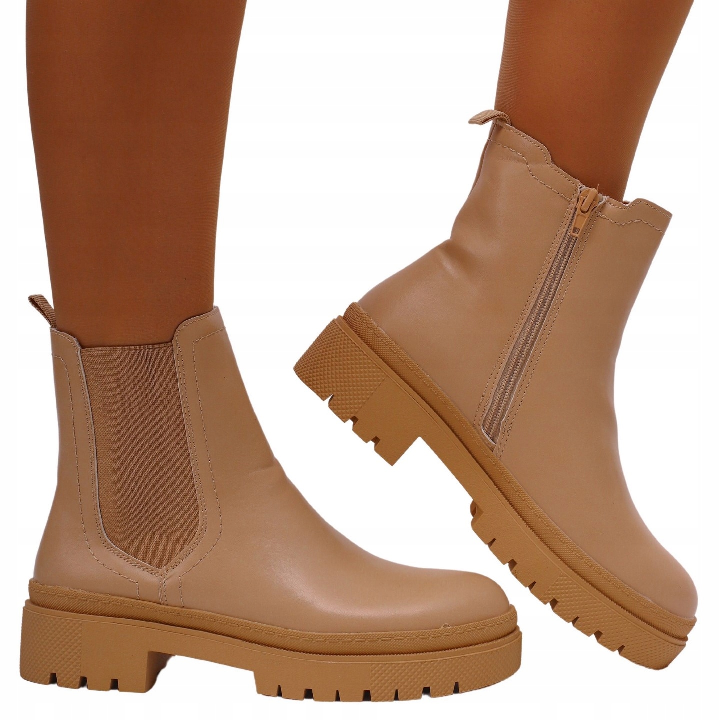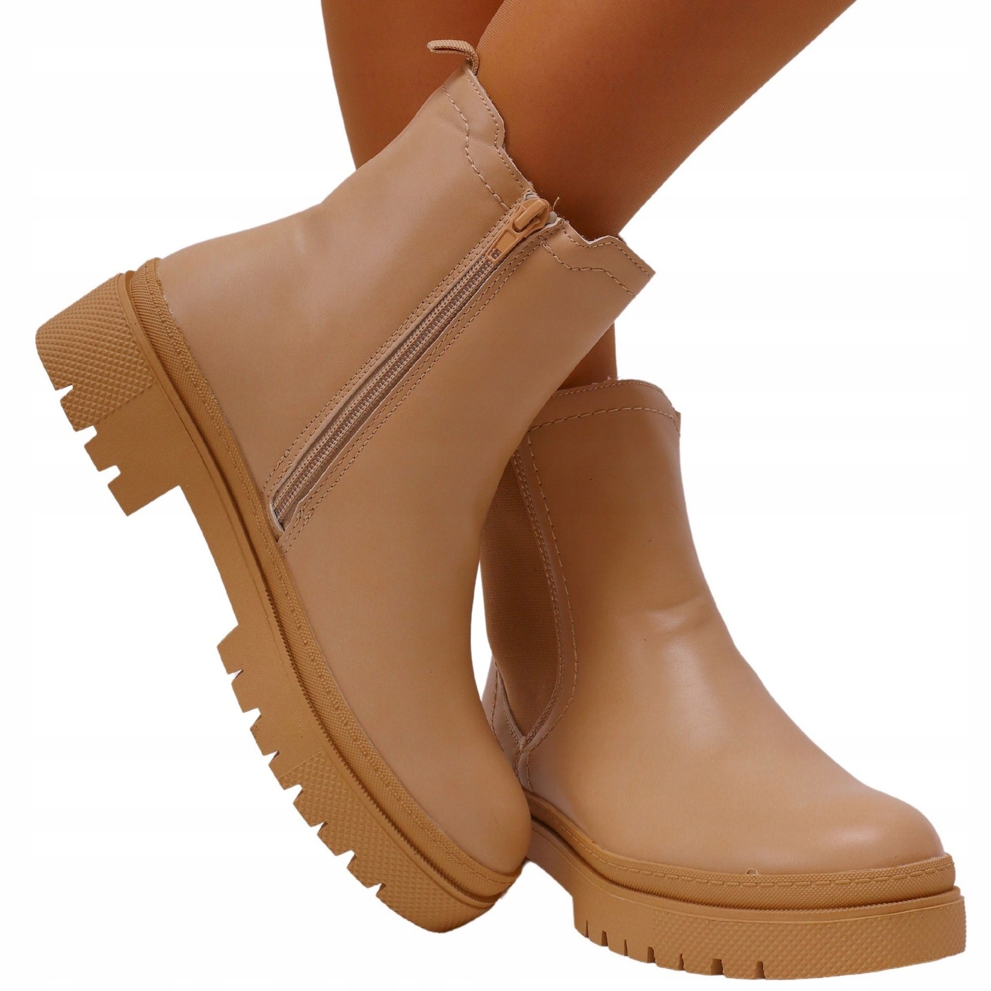 Жіночі бежеві черевики. Вони мають застібку на блискавці, що дозволяє легко надіти. Стабільна, густа підошва добре поглинає стопу. Простий зріз змушує їх відповідати багатьом стилям. >
