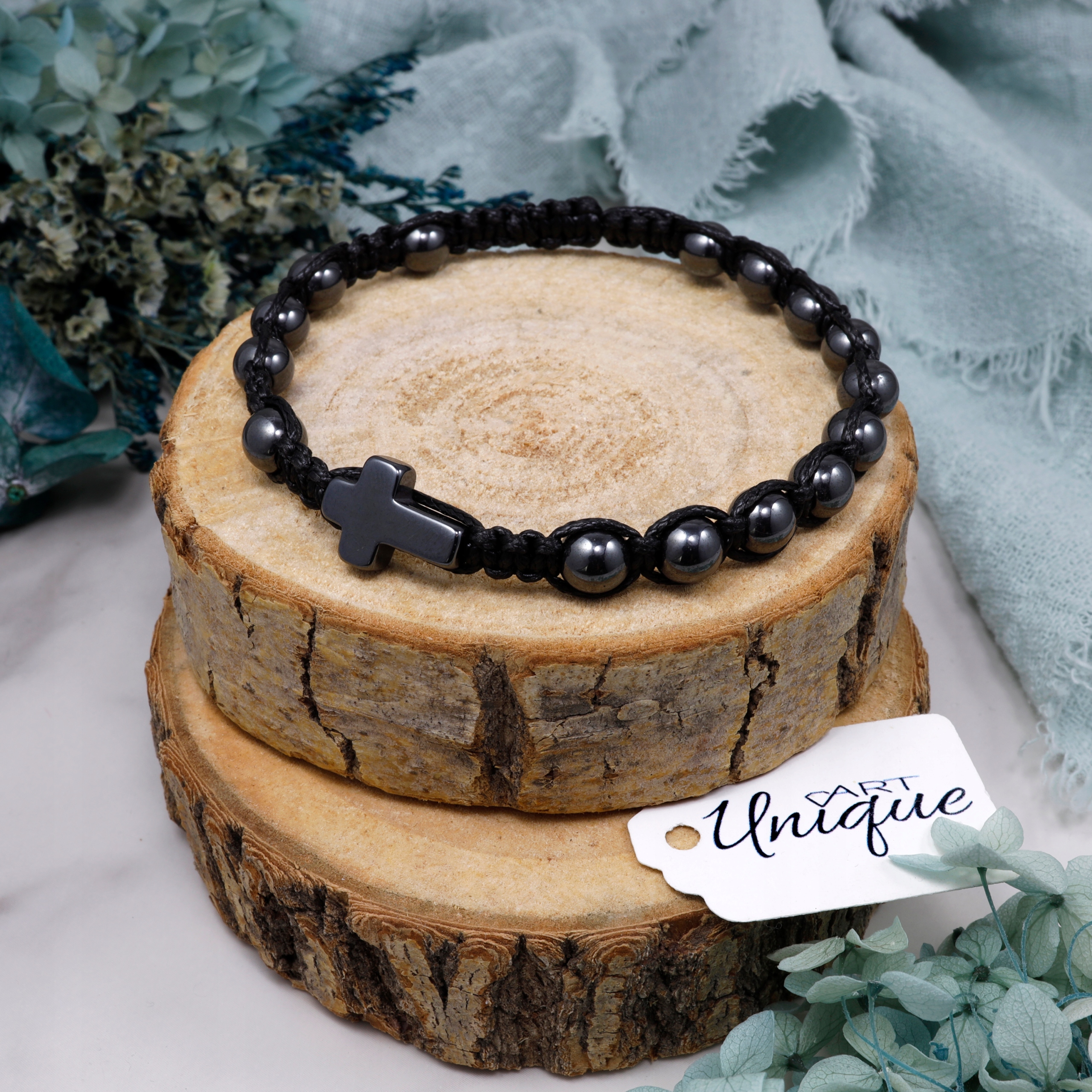 Браслет, виготовлений з природних декоративних каменів - Чорний гематит методом макрамної коси, виготовленого з високоякісних волокон з підвищеною стійкістю до витирання та води 4 /p>