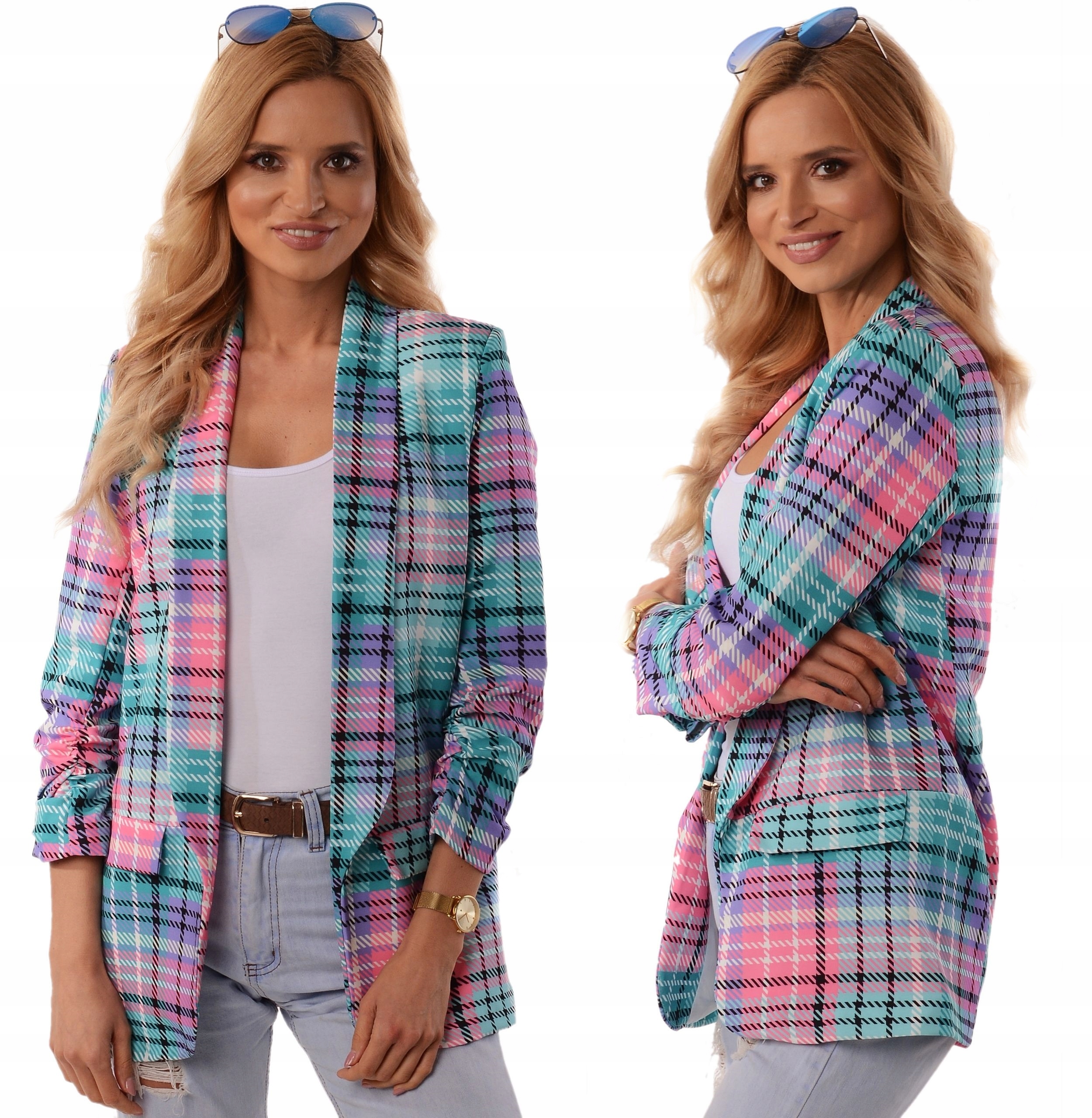 Унікальний, модний, вільний піджак з оригінальним кольоровим візерунком у клітинку.