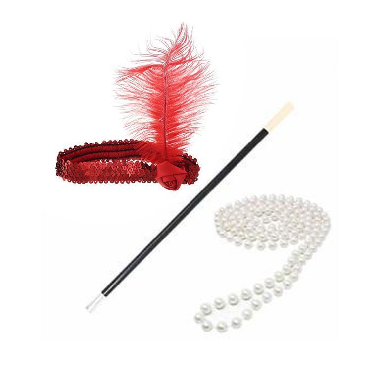 КОМПЛЕКТ: ЕЛЕГАНТНА ПОВ'ЯЗКА З ПАЙЄТКАМИ З ПІР'ЯНИМ БУРЛЕСКОМ + НАМИСТО З ПЕРЛАМИ + СИГАРИТА / ЧАРЛЬСТОН 1920-1930-1940-ті
