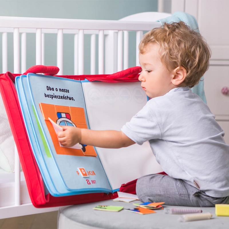 Книжка надасть вашій дитині простір для малювання, крок за кроком провівши її через процес створення малюнка. З одного боку книжки пазли на липучках, які створюють картинку, з іншого боку порожнє місце для малювання. Щоб полегшити дітям завдання, у верхній частині кожної порожньої сторінки є графічна інструкція, як створити малюнок, який видно на пазлі поруч. До книжки додаються спеціальні кольорові олівці та чарівні губки, які, намокнувши, зітруть раніше намальовану роботу, щоб веселощі могли початися спочатку. Кожна картинка-головоломка описується назвою об'єкта або транспортного засобу, який видно на ній. Все це доповнюється зручними ручками та практичною блискавкою, яка дозволяє застібати книгу.