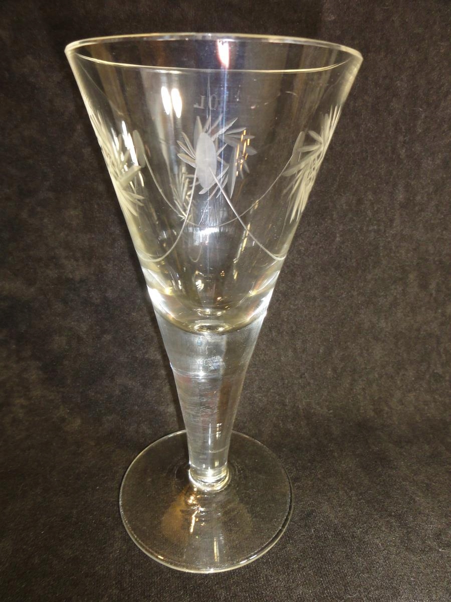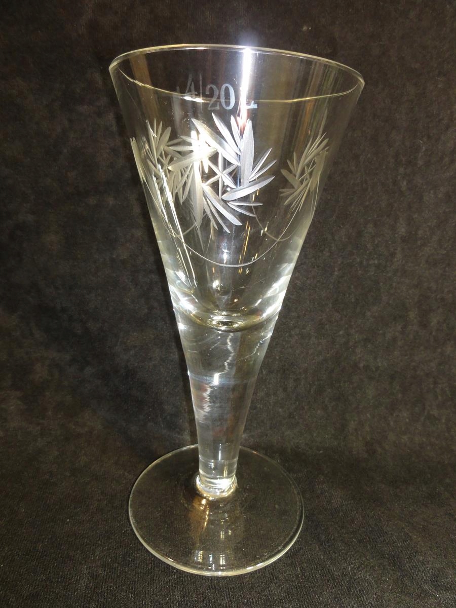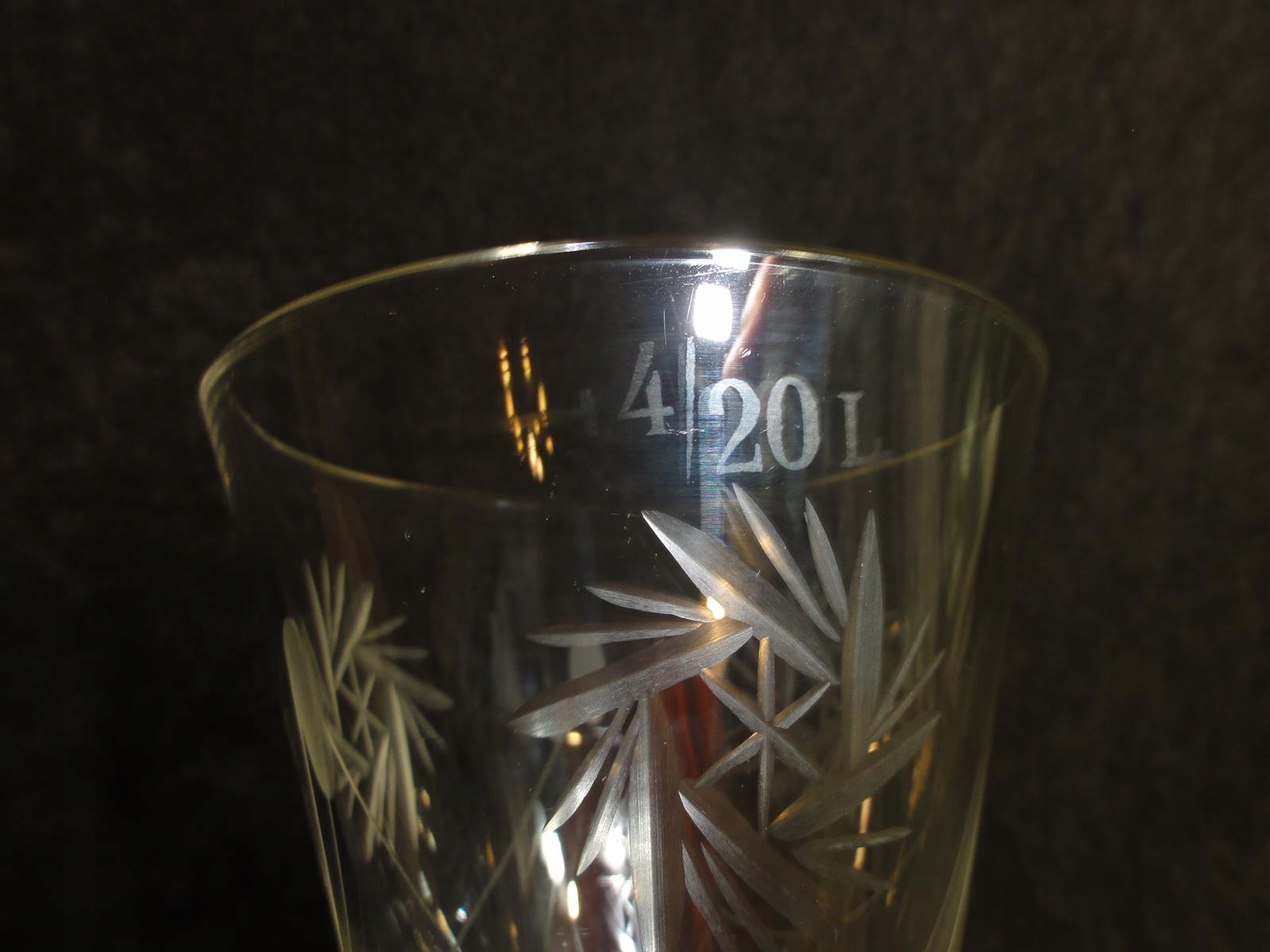 * келих із кришталевого скла, видувний у формі, ніжка та основа гладкі, позначена місткість 4/20 л