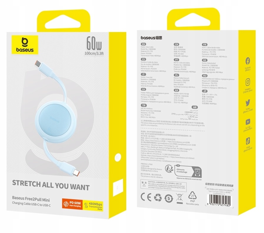 Це Baseus Free2Pull Mini, кабель USB-C – USB-C, який поєднує в собі інноваційні функції та компактний дизайн. Він сумісний із технологіями Power Delivery та Quick Charge, що робить його ідеальним для різноманітних пристроїв, від смартфонів до ноутбуків.