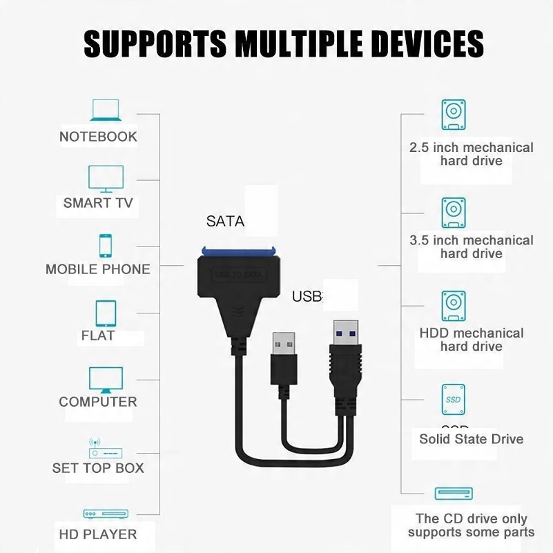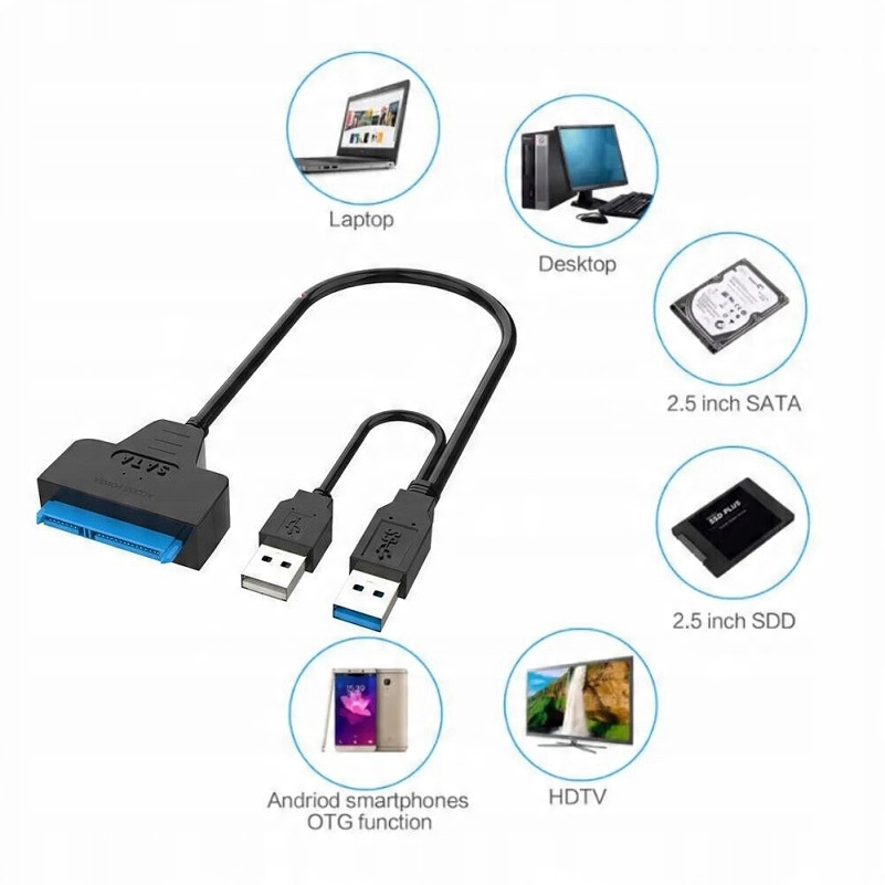 2. Подвійні USB-порти: це перехідний кабель із двома USB-портами, USB 2.0 і USB3.0 на 15 + 7-контактний роз’єм SATA, він ідеально підходить для резервного копіювання файлів або оновлення жорсткого диска вашого ноутбука/ПК.