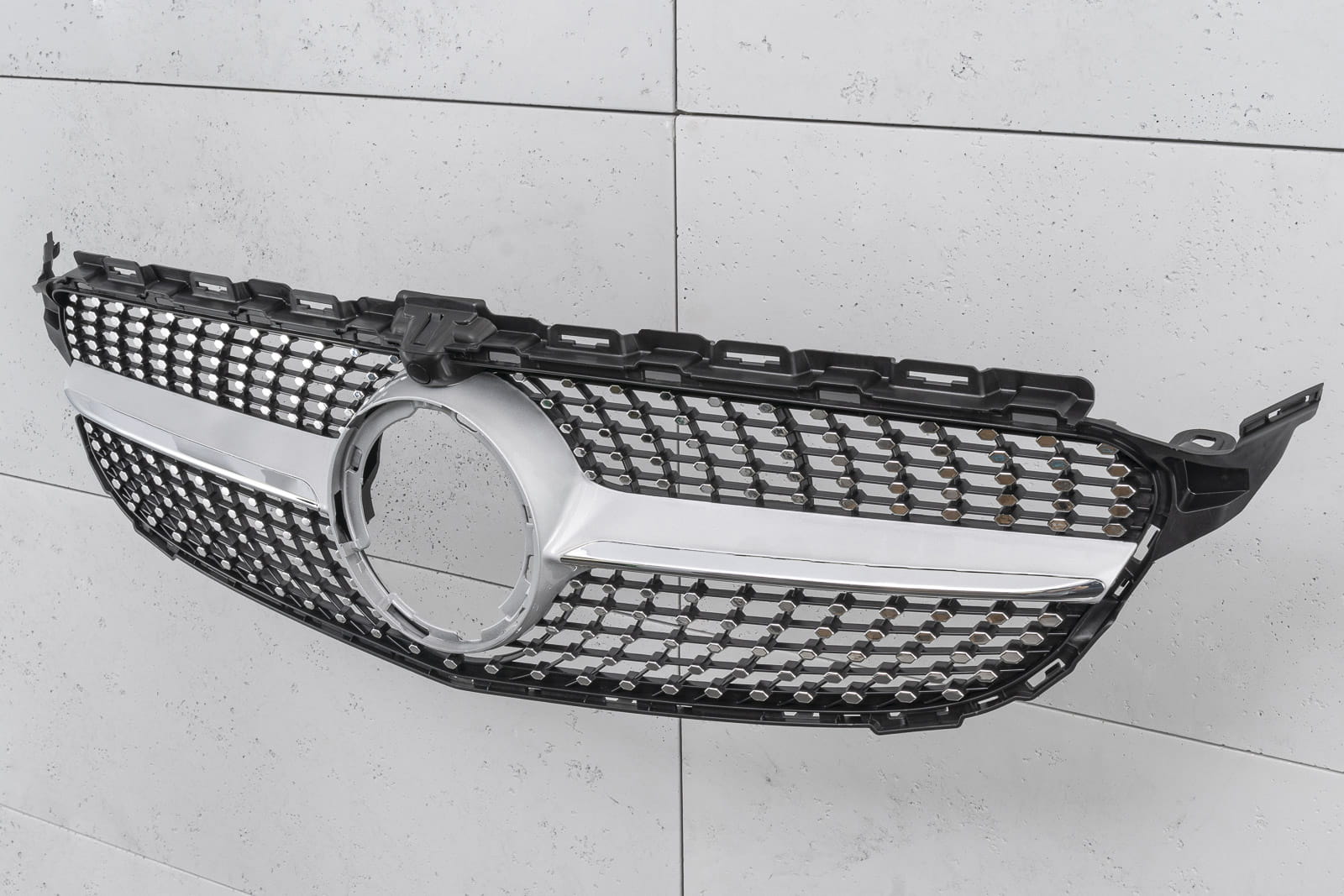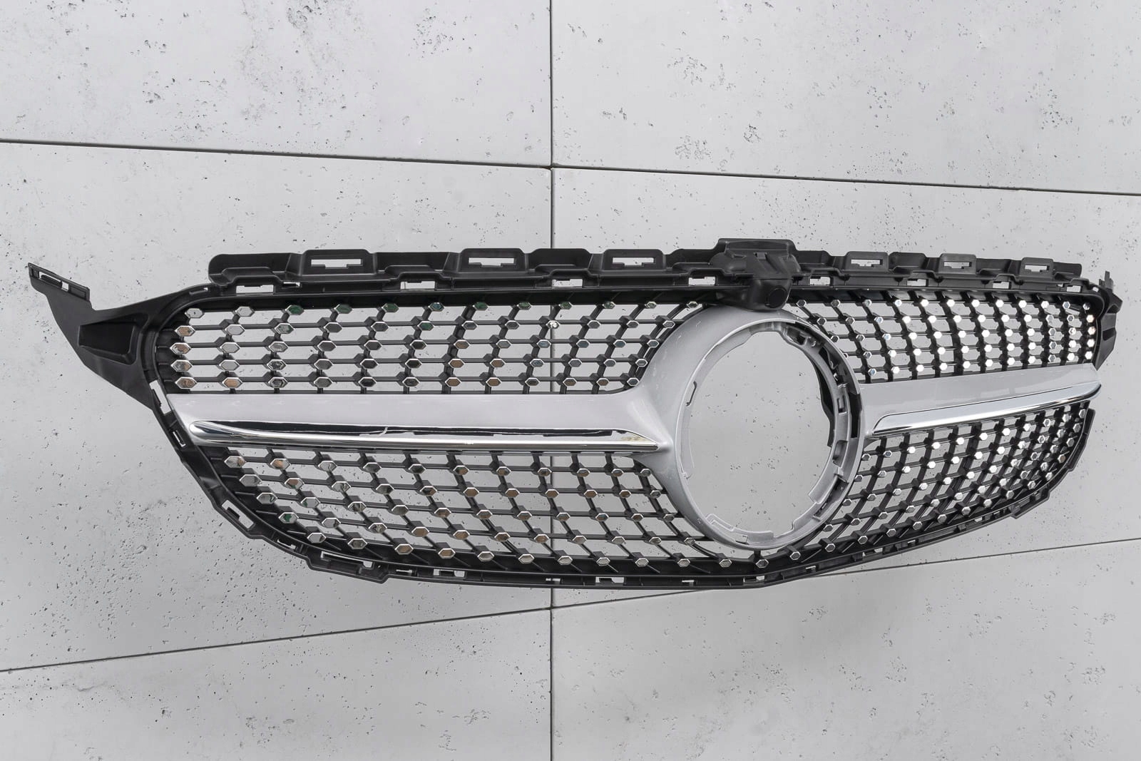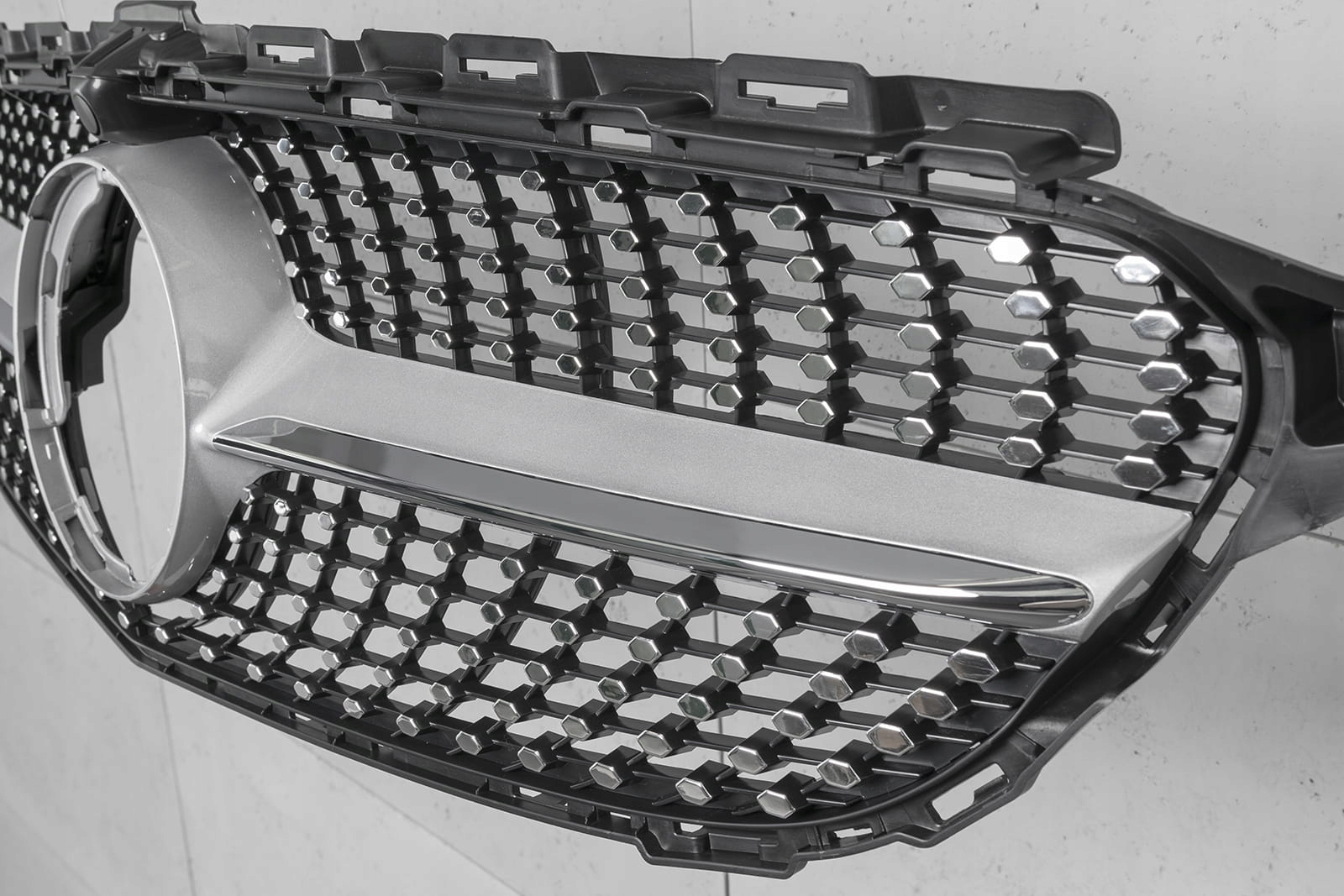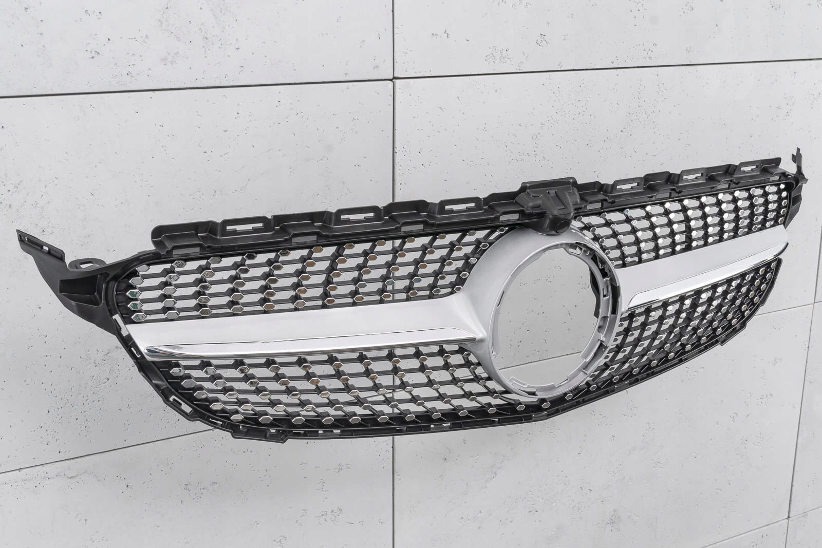 Спеціальна решітка була розроблена, щоб ідеально відповідати вишуканому дизайну класу С. Сітка решітки прикрашена сріблястими шпильками, які радіально поширюються з обох боків елемента, надаючи йому вражаюче оригінальний стиль, типовий для найрозкішніших автомобілів. моделі. Заповнюючи простір навколо знаку MERCEDES, вони оточують його елегантною рамкою. Решітка DIAMOND дозволяє створити модний, сучасний стиль автомобіля, який підкреслить візуальні якості автомобіля.