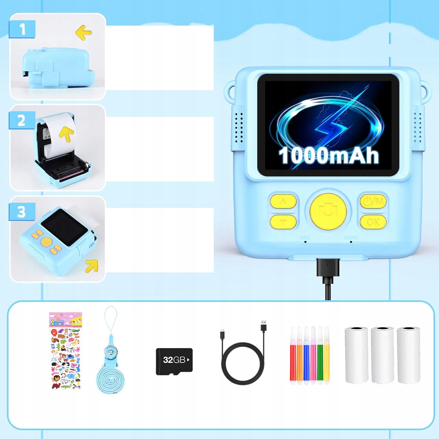 📦📦📦 Пакет включає:1x камера, 3x рулони паперу для друку, 6x кольорові ручки, 1x Шнурок, 3 наклейки, 1 карта TF на 32 ГБ, 1 зарядний кабель.