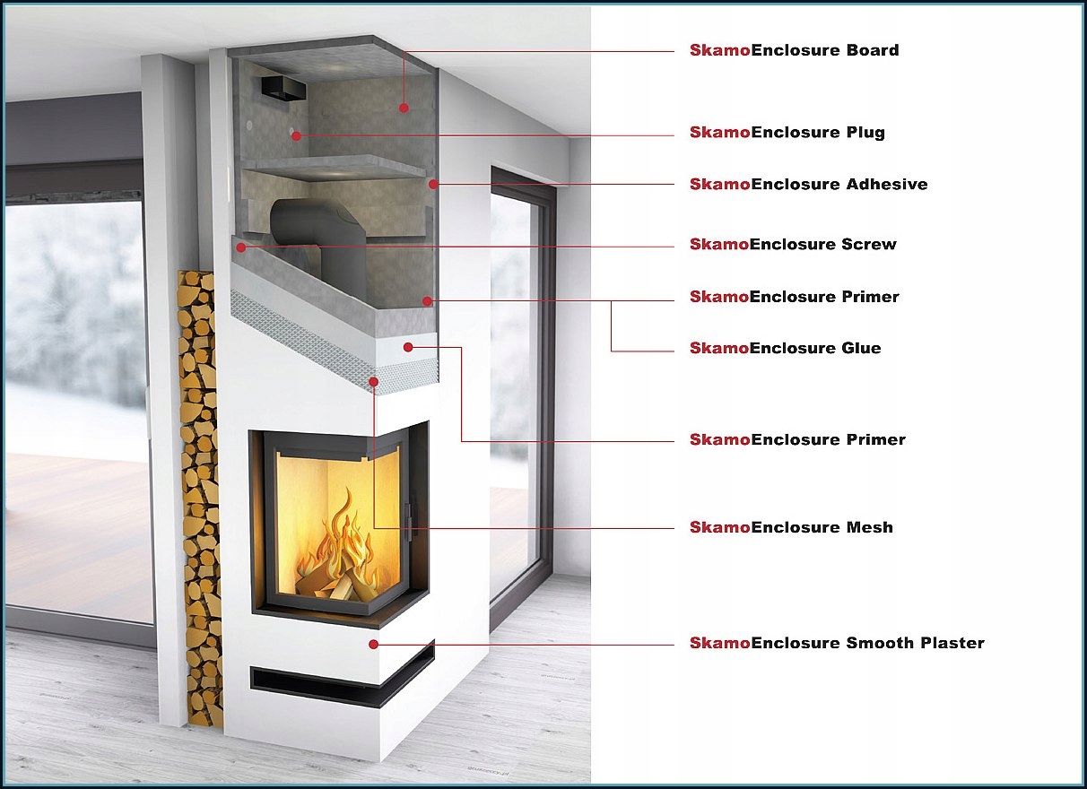 Скамооклознята плата силікату вогонь -єдина конструкція та ізоляційна пластина, доступна на ринку. Це створює легку та жорстку конструкцію і легко обробляти за допомогою традиційних столярних інструментів. Встановлення пластин проводиться за допомогою клею клею Skamoenclosure та TD. Він замінює традиційне рішення на основі G-K та мінеральної вовни. Він ідеально підходить для ізоляції дерев’яного променя, бічних стін та стін за каміном.
