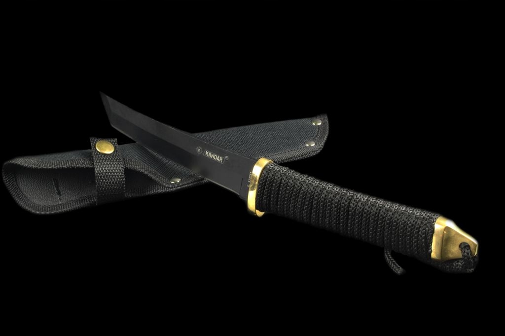 KANDAR — це великий, важкий, дуже міцний і ретельно виготовлений ніж із повноцінною конструкцією з оксидованим лезом танто. Кинджал танто походить з Японії - Країни висхідного сонця, гейш і самураїв, для яких він був доповненням до дайшо - базового набору мечів - катани і вакідзасі.Танто мав, як правило, однолезовий клинок довжиною від 150 до 300 мм; залежно від типу та розміру, його носили як шото з комплектом дайсьо або окремо, наприклад, захованим у складках кімоно, як чоловіки, так і жінки, як «зброю останнього випадку», хоча його також використовували для вчинити ритуальне самогубство – сеппуку Рукоятка ножа KANDAR Tanto – це т.зв. cord wrap, тобто обплетення, виготовлене - у цьому випадку з міцної товстої мотузки - безпосередньо на сталевому хвостовику ножа, як у самурайських мечів, що забезпечує чудове зчеплення з рукою. Технічні дані: