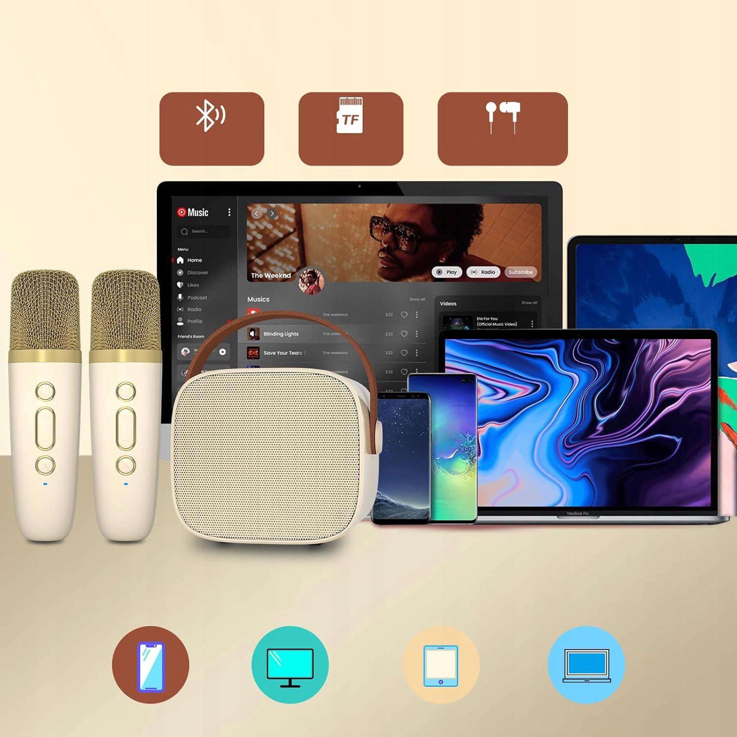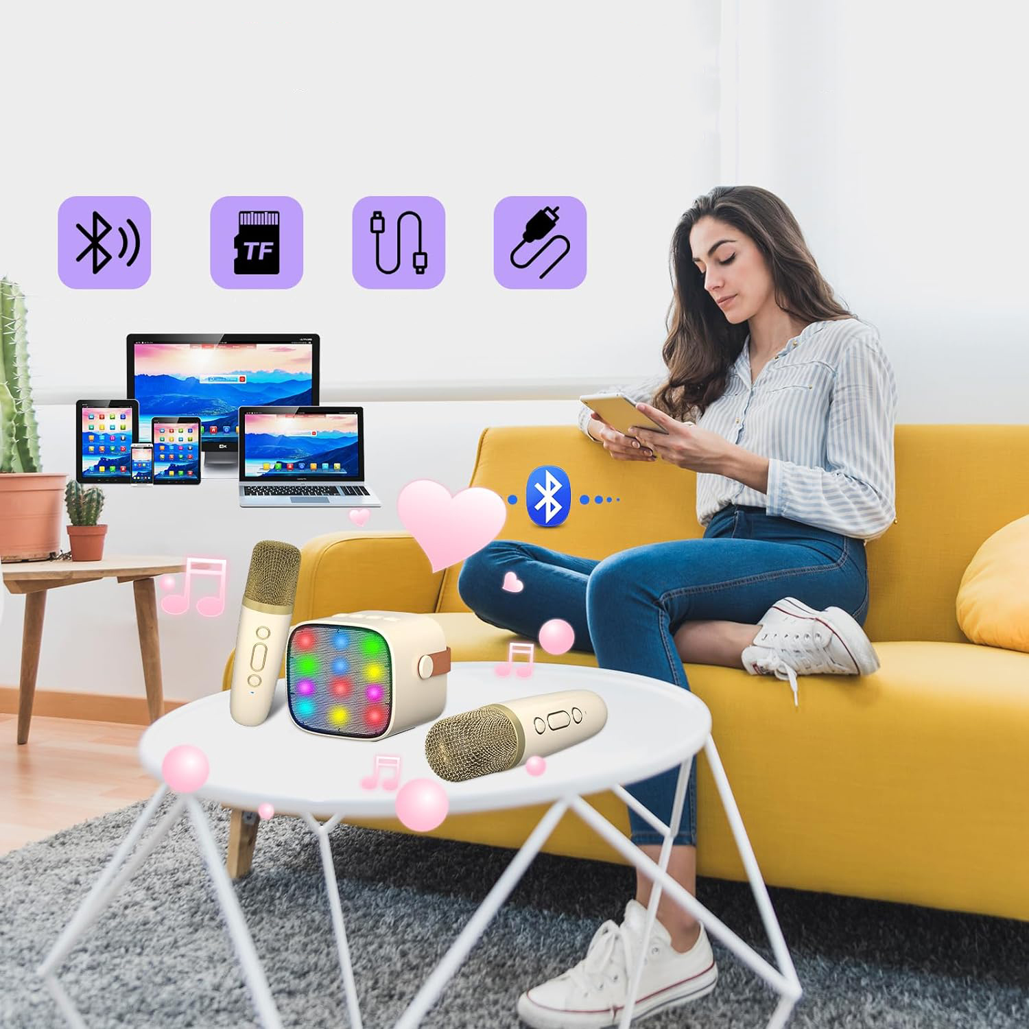 - пристрій караоке Bluetooth з 2 бездротовими мікрофонами, автоматично підключається до оратора, коли він увімкнено, його діапазон до 10 м, може окремо контролювати людський голос/ефект ехо/том музики. Смартфони, настільні комп’ютери, ноутбуки та інші музичні програми, з'єднання є швидким та стабільним. Світлодіодні ліхтарі пульсують ритм музики, діти люблять танцювати вогні, які випускаються з звуком. Підтримка TF Пам'ять з MP3 піснями, співати, співати, грати музику, слухати пісні, як вам подобається. ММ