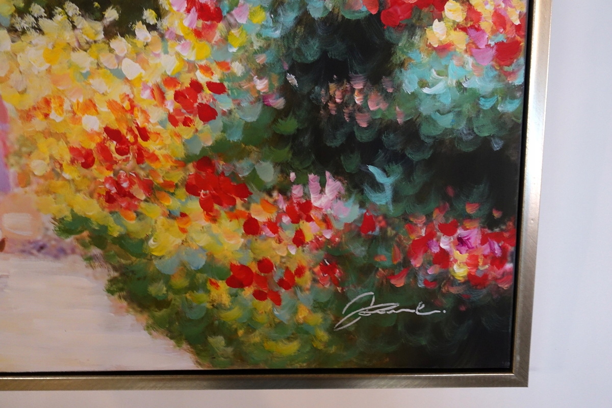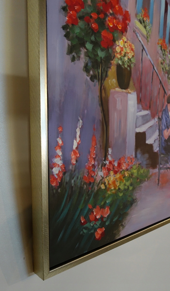 Картина написана в сучасному стилі, маслом на полотні, обрамлена в ніжну тонку раму кольору патинованого срібла. Мотив, який ми бачимо, – це чарівне, заквітчане подвір’я, побачене очима художника в техніці шпаклівки (густа структура фарби). Добре підібрані, яскраві кольори – це єдина його перевага. Я наполегливо рекомендую вам придбати картину, яка обов’язково стане прикрасою стіни у вашому домі.