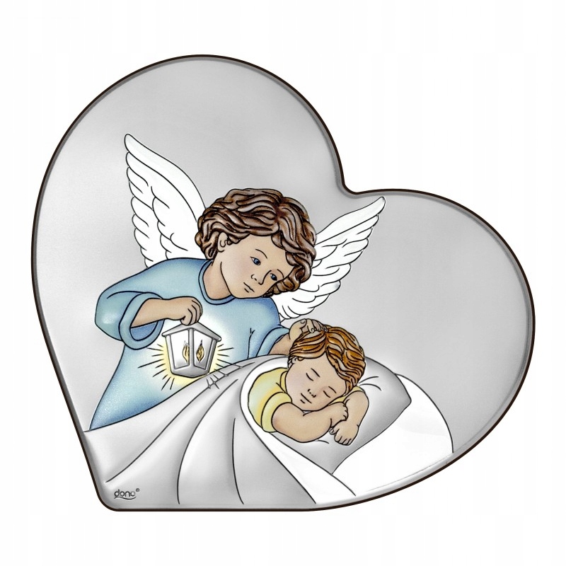 Срібна картина із зображенням Ангела з ліхтариком, який спостерігає за немовлям, - ідеальний подарунок на Хрещення.