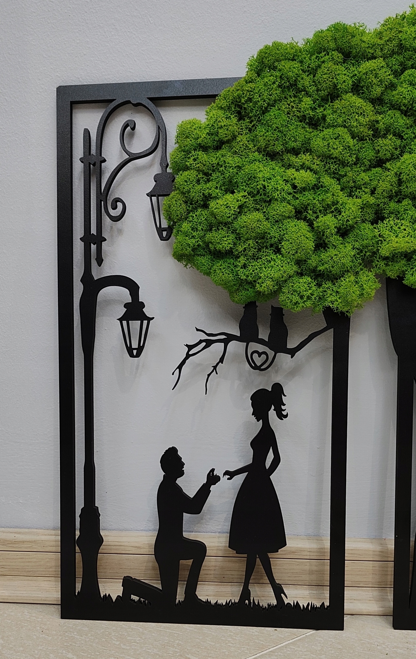 2 дерева, вкриті фінським мохом.Кожне панно - це частина історії. Спочатку заручини, потім вагітність, одна дитина, потім двоє. Романтична, символічна та зворушлива картина, яка порадує всіх членів сім'ї.Триптих з 4 частин я адаптую до вашої історії.