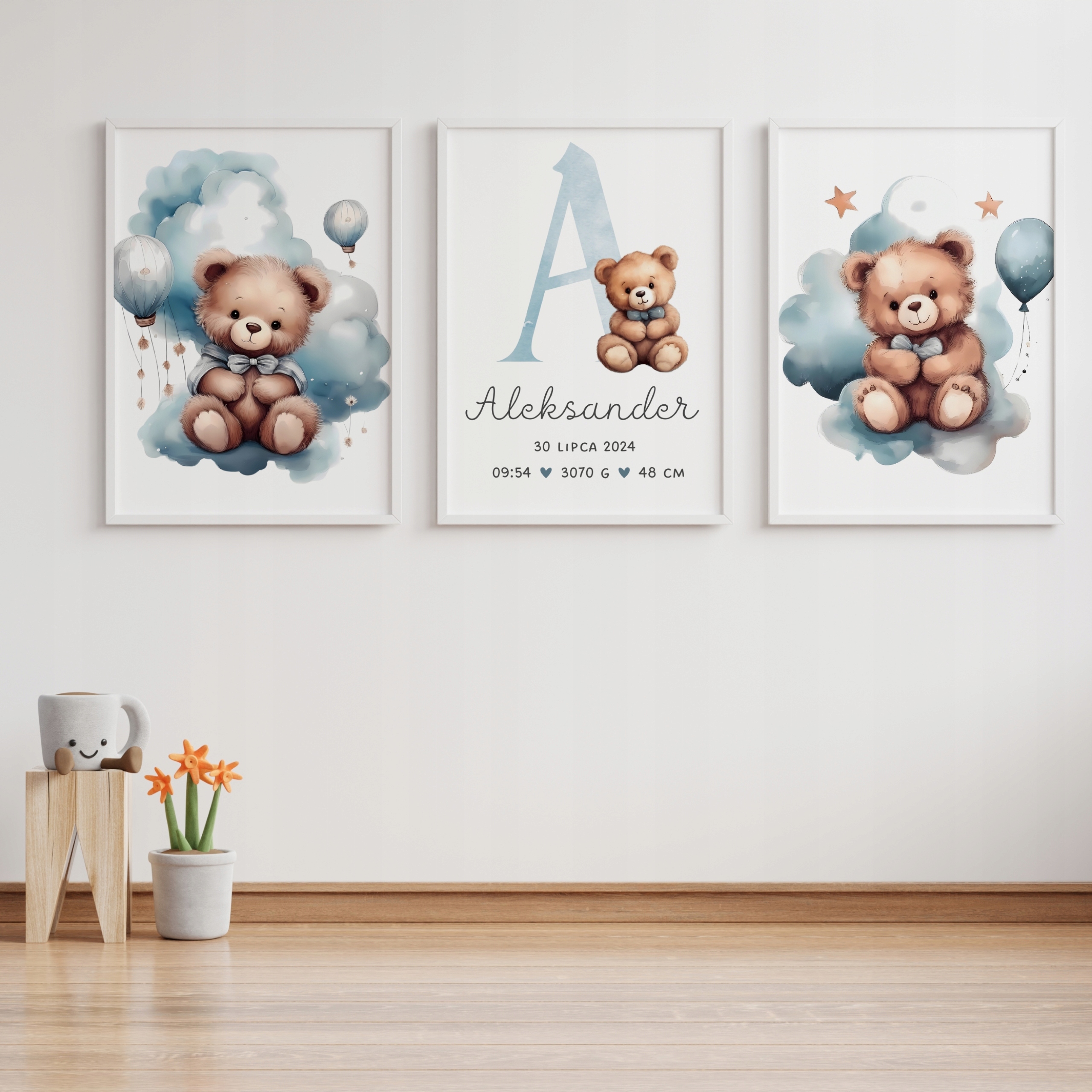 Настінні картини для дитячої кімнати - Свідоцтво про народження хлопчика - Набір з 3 постерів без рамки