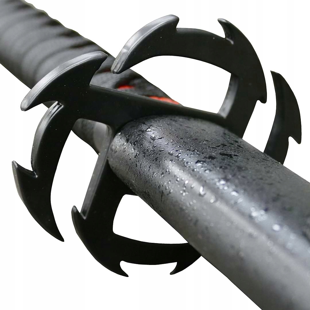 - Катана виготовлена з нержавіючої сталі 440, пофарбованої в чорний колір. Має металеву цубу, також пофарбовану в чорний колір. Катана поставляється з чорними піхвами – сайя. Тесьма такого ж кольору, під тасьмою червона імітація шкіри ската з пластику, що надає характерності всій катані. Усе це зроблено дуже акуратно.