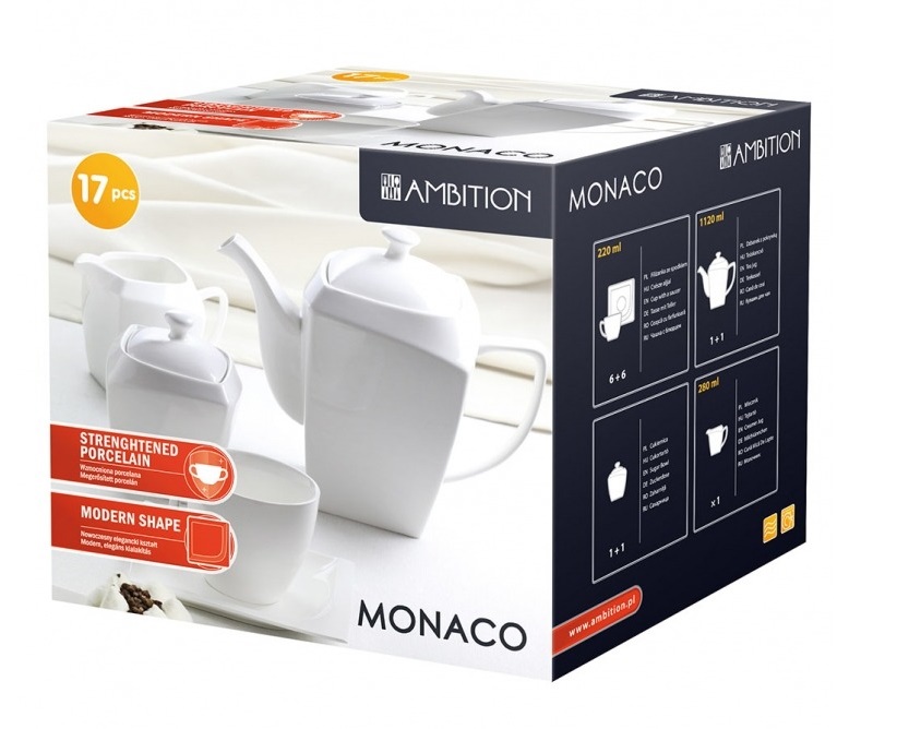 Кавовий набір з 17 предметів лінії Monaco з високоякісної порцеляни New Bone China, додатково посилений, гарантує вища стійкість до відколів і високих температур.
