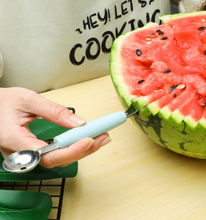 Завдяки двосторонньому дизайну, наш куттер має ложку на одному кінці, яка ідеально підходить для створення рівних і привабливих кульок з динь, кавунів, цитрусових та багатьох інших фруктів.