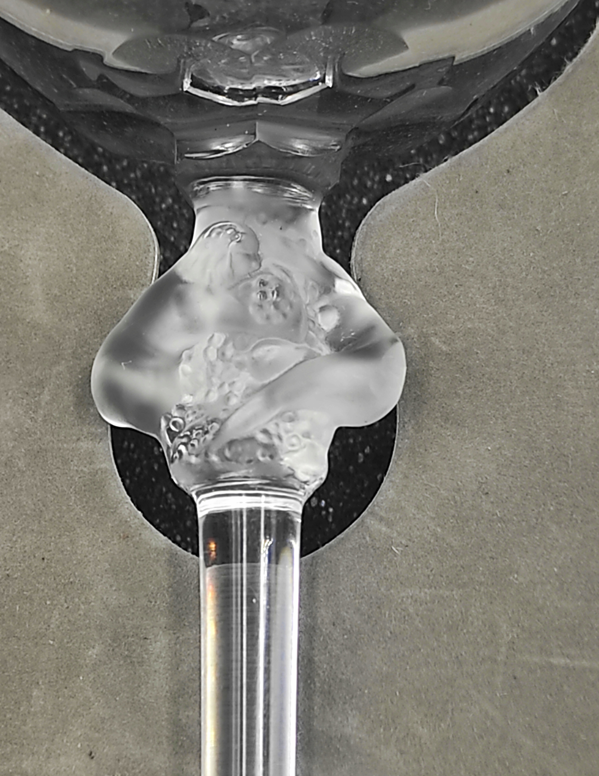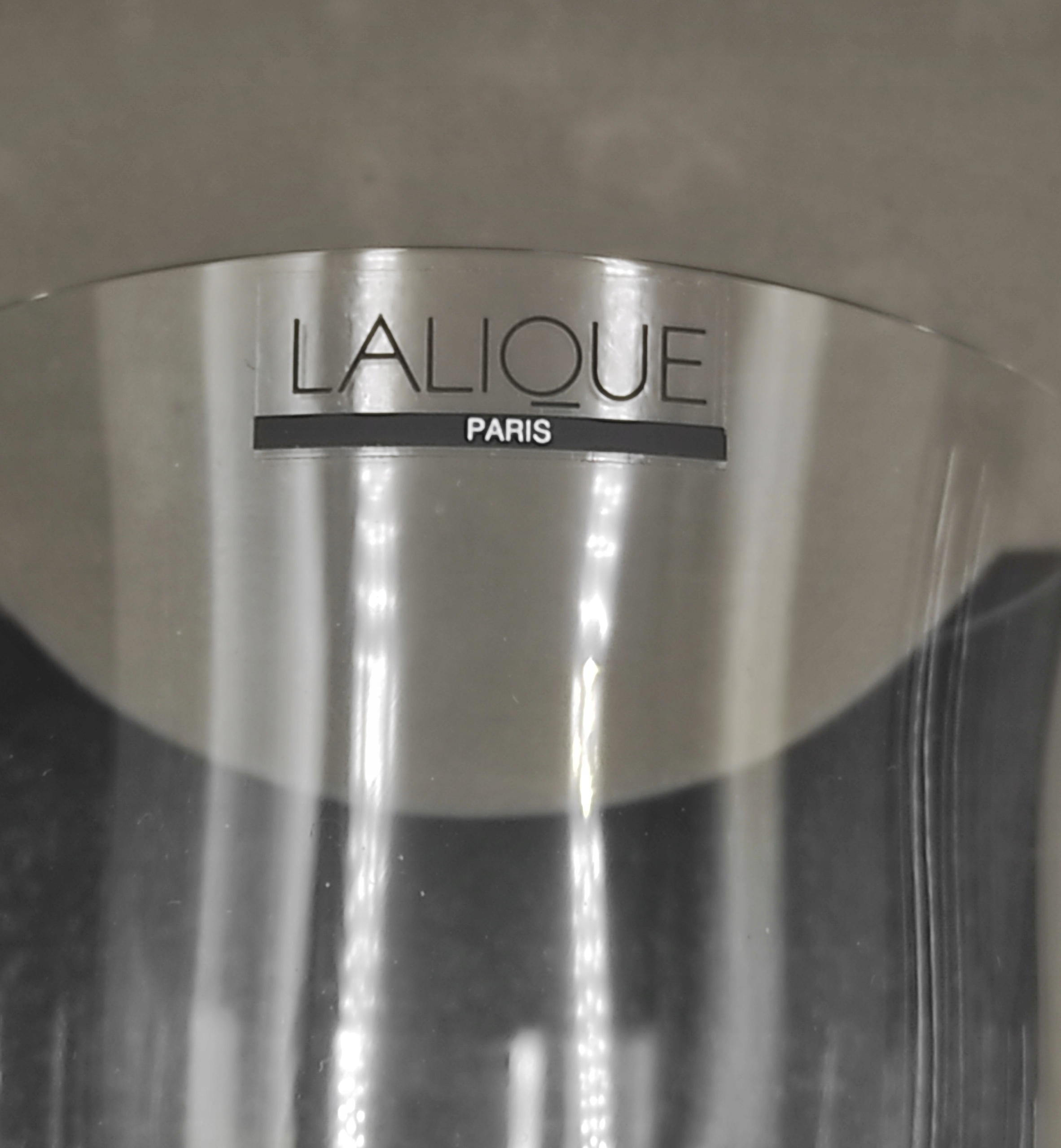 Lalique характеризується незвичайним поєднанням прозорого та матового скла. Завдяки такому поєднанню скло виглядає так, ніби воно зроблено з брили льоду, ретельно вирізаної з надзвичайною майстерністю та пристрастю. Келих, як і личить такому розкішному бренду, був виготовлений з кришталю найвищої якості. Келих належить до колекції Roxanne, представленої компанією Lalique i в 1968 році. Дизайн включає прозору чашу та ніжку з двома матовими оголеними лозами серед виноградних лоз, обвитих навколо ніжки.