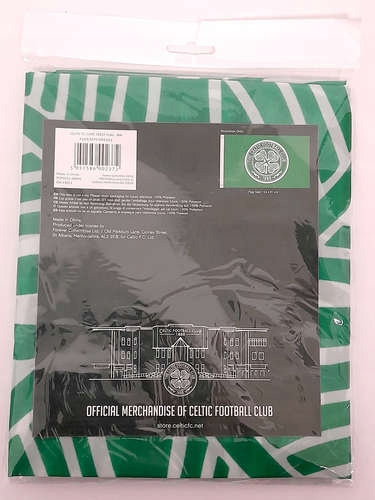 Опис: виготовлений з штучного матеріалу, великий, один -прапор шотландського футбольного клубу кельтський Глазго з його пальто. Прапор має розміри 152 х 91 див. З одного боку є отвори, які дозволяють встановлювати його на дерево або щогли. Він упакований у пачку з офіційним клубним лейблом. Це офіційний сувенір клубу з Глазго.