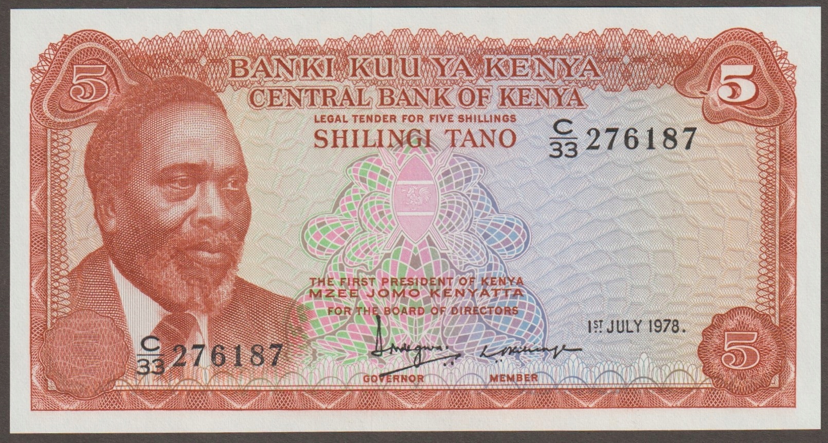 Kenia 5 shilling 1978 - Yomo Kenyatta - stan bankowy UNC
