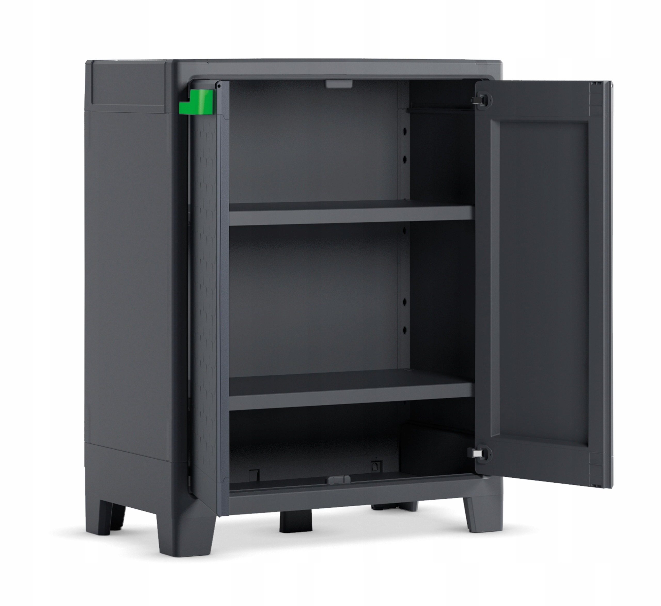 Низька шафа Moby ідеально підходить для будь-якого гаража, домашньої майстерні чи іншої кімнати підсобне приміщення, та ще й на балкон чи терасу. Відрізняючись найвищою якістю виготовлення та універсальним і простим дизайном, він неодмінно виправдає очікування найвимогливіших користувачів. Функціональна і повністю водонепроникна шафа Moby виготовлена з волого- та УФ-стійкого пластику. Ця модель оснащена двома регульованими полицями з максимальною вантажопідйомністю 30 кг кожна. Велика ємність для зберігання гарантує легку організацію великої кількості різноманітних видів речей. Однією з багатьох переваг представленої моделі є великі зручні ручки, які забезпечують комфортне відкривання та закривання дверей. Додатковою зручністю є спеціальні отвори, які дозволяють закрити шафу на замок, що значно підвищує безпеку вмісту, що зберігається. Загальне навантаження низької шафи Moby на регульованих ніжках становить цілих 90 кг! Виріб призначений для самостійного монтажу.