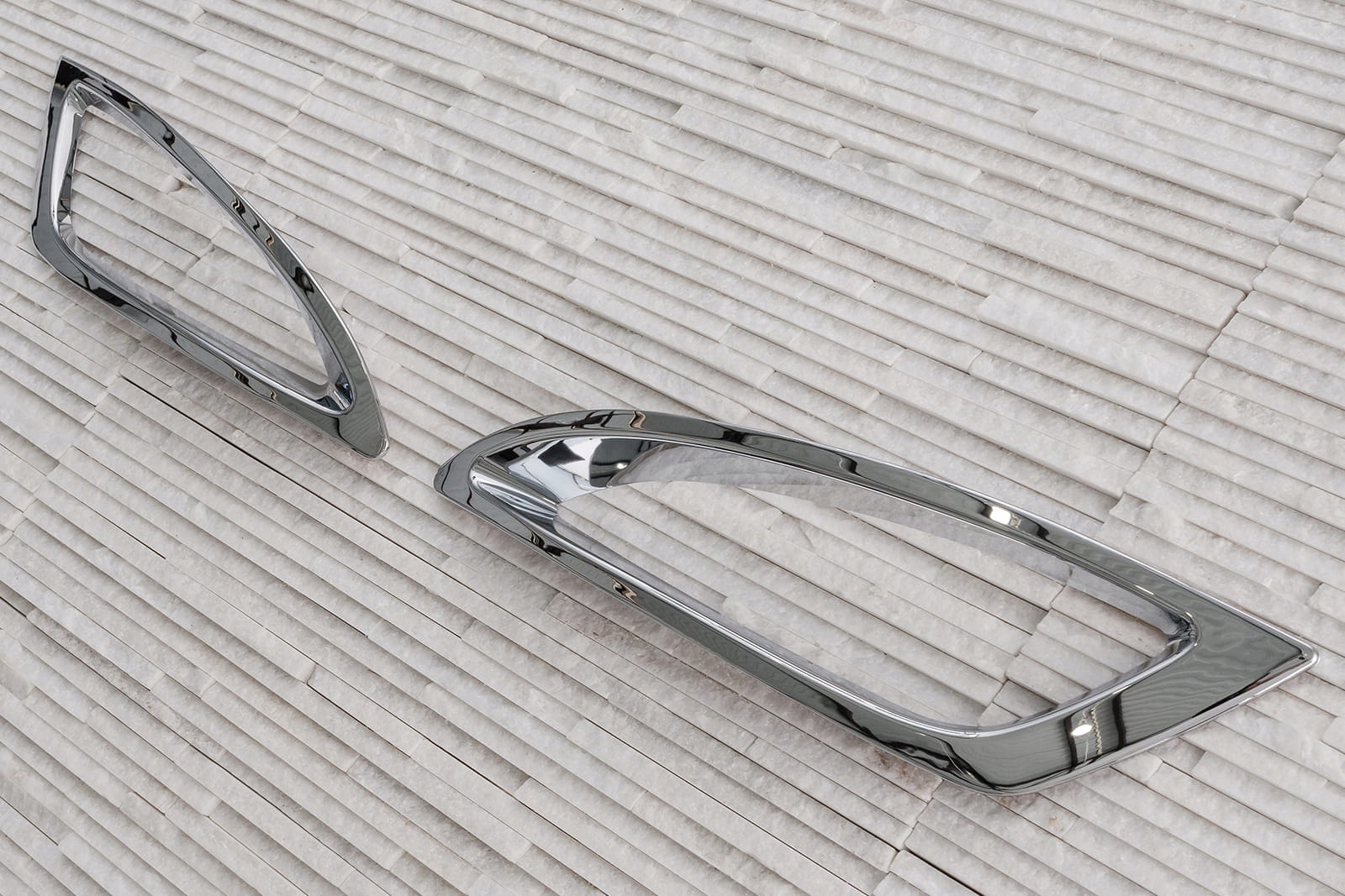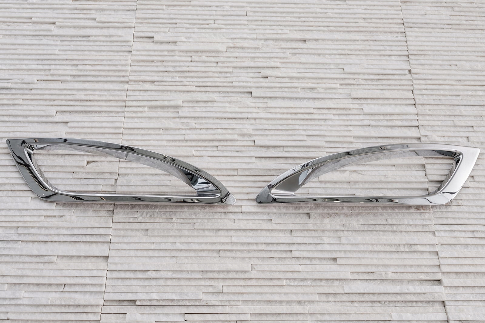 Виріб виготовлено з високоякісного хромованого ABS-пластику. У комплект входить набір з двох накладок передніх протитуманних фар.