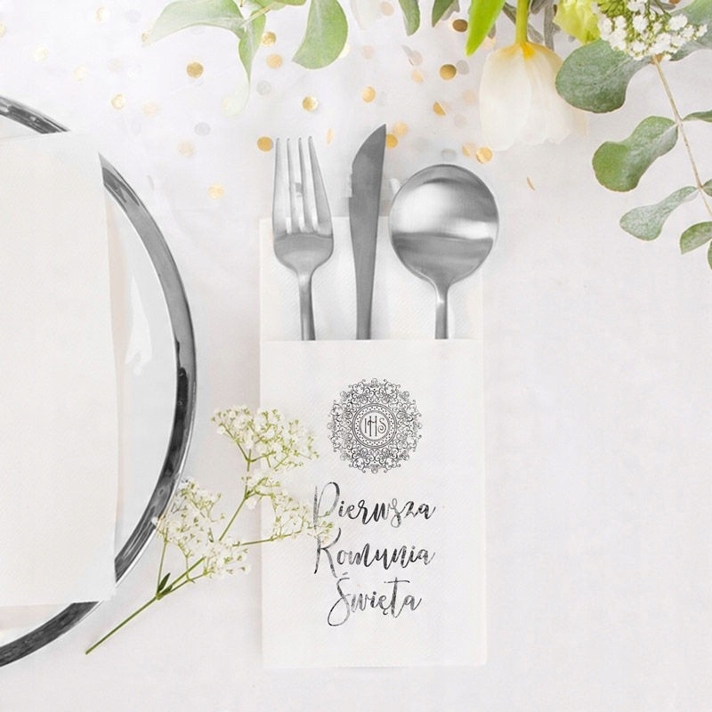 - композиція: 20 штук білих кишеньок для столових приборів, прикрашених написом First Holy Communion та мотивом Гостиї у сріблі;