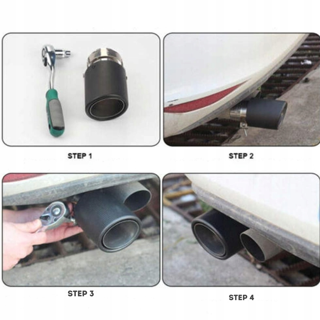 - Застосування: наконечник глушника використовується для естетичної обробки вихлопної труби та надання транспортному засобу спортивного вигляду . Це також може впливати на делікатну зміну звуку видиху та захистити задню трубу від корозії.