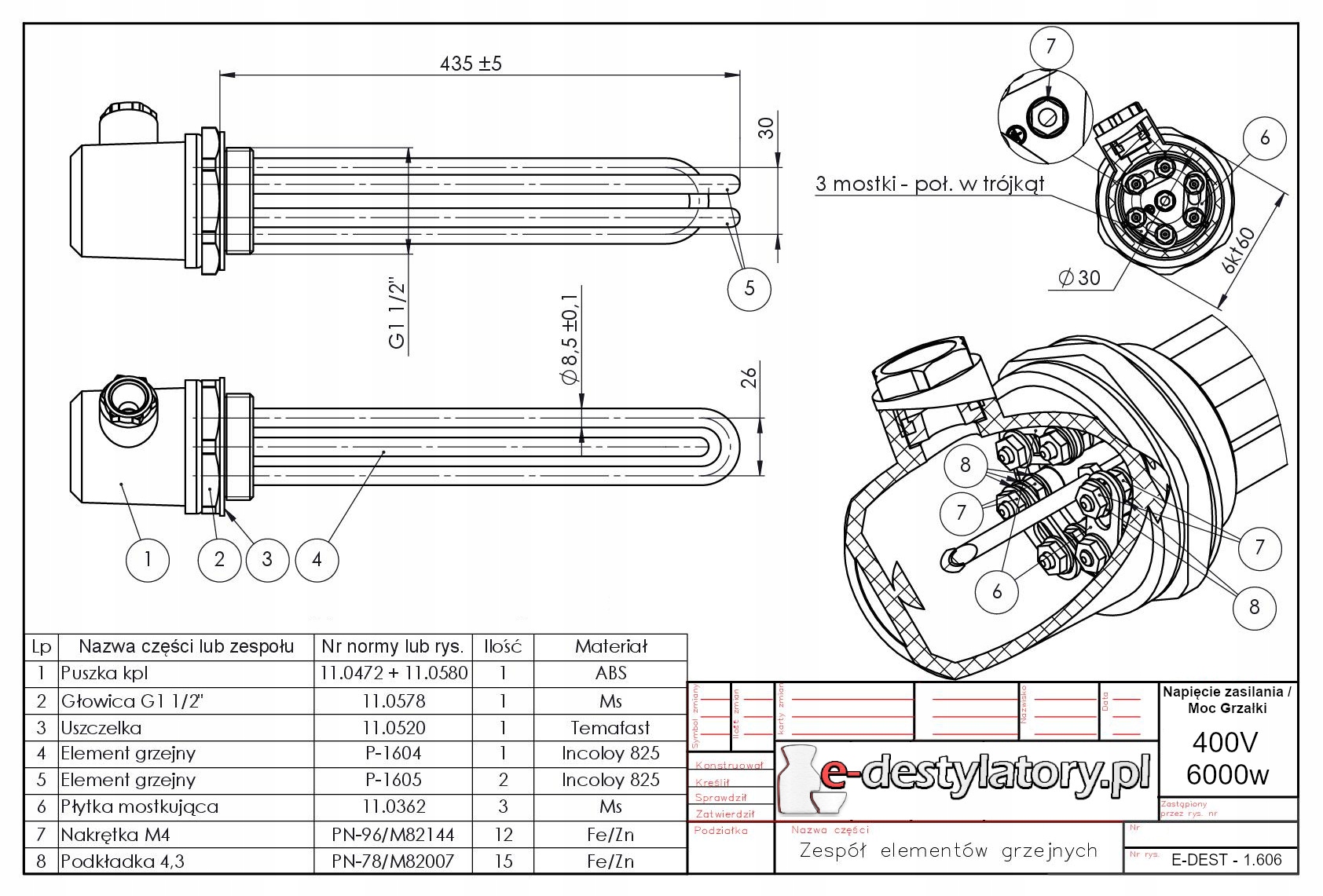 Кислотостійкий обігрівач CWU Incoloy 6kw 400V Gwin 1.5