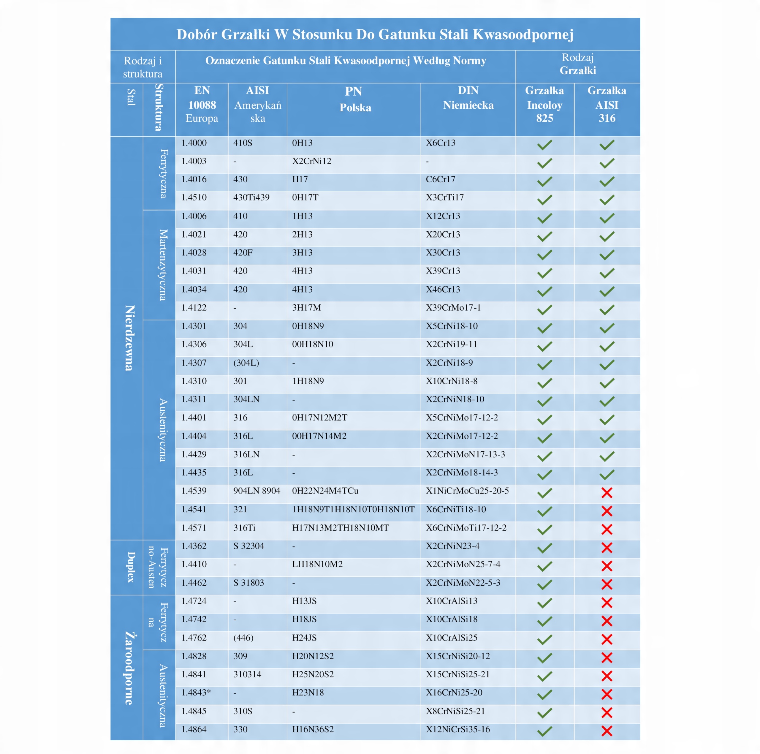 Для кращої ілюстрації нижче наведено таблицю, у якій показано вибір нагрівача для даної марки кислотостійкої сталі: