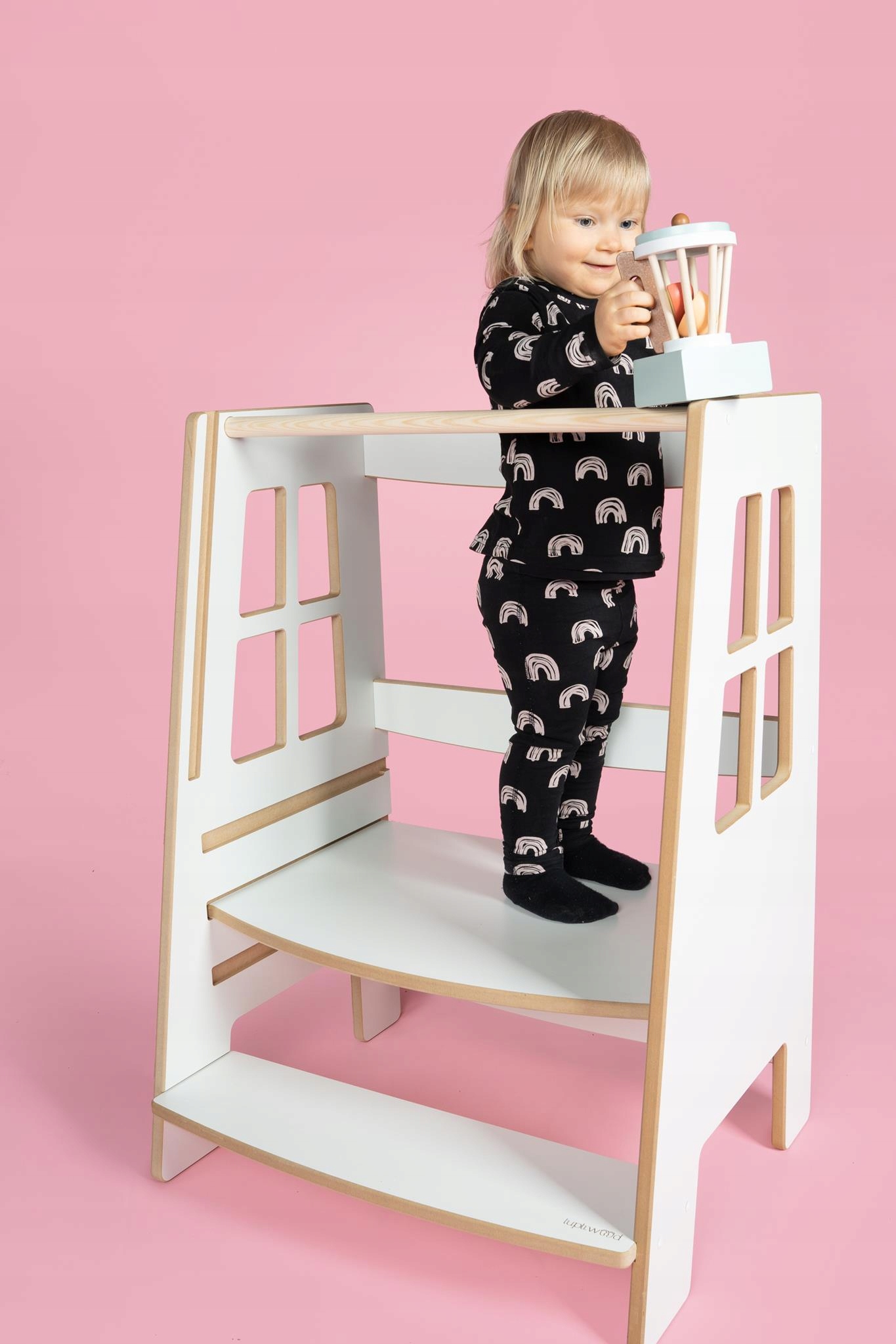 Кухонний помічник DOUBLE SAFE - це, перш за все, SAFE. Ззаду має перекладину і висувається засув, щоб малюк міг самостійно забратися на помічника - завдяки цьому ми зменшуємо ризик падіння дитини назад під час гри. Завдяки 3-ступінчастому регулюванню платформи помічник росте разом з дитиною і прослужить йому дуже-дуже довго - висоту можна регулювати, не розбираючи його. В самому низу є сходинка, яка полегшує підйом. Помічник стійкий завдяки відповідній конструкції та вазі виробу.
