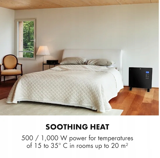Чорна елегантність пробуджує теплі почуття та забезпечує приємне тепло для тих, хто носить капці та піжами: конвекційний обігрівач Klarstein Norderney гарантує рівномірне підвищення температури та рівномірний розподіл теплого повітря в приміщеннях площею до 20 м² / 40 м³.