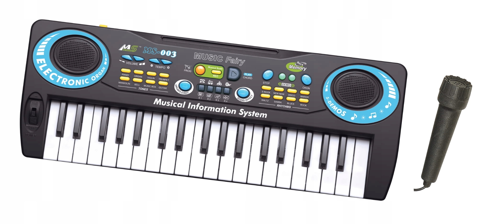 37-клавішна дитяча клавіатура з мікрофоном. Піаніно дозволяє вибирати акустичні фони та акомпанемент, записувати власні композиції та співати в мікрофон.