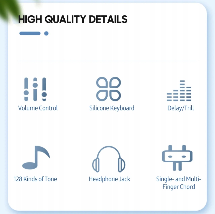 Приємні до шкіри, зносостійкі, м’які та міцні клавіші забезпечують комфортний дотик, як справжнє піаніно, і виразну якість звуку. Чудовий інструмент для навчання та розваги зі звуком. Легко грати, ідеально підходить для дітей або дорослих початківців.
