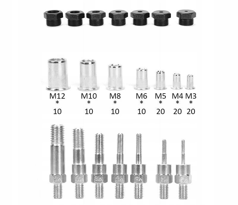 ⭐Заклепальник оснащений набором з п'яти головок розмірів: M3, M4, M5, M6, M8, M10, M12. У набір входить загалом 100 заклепок.