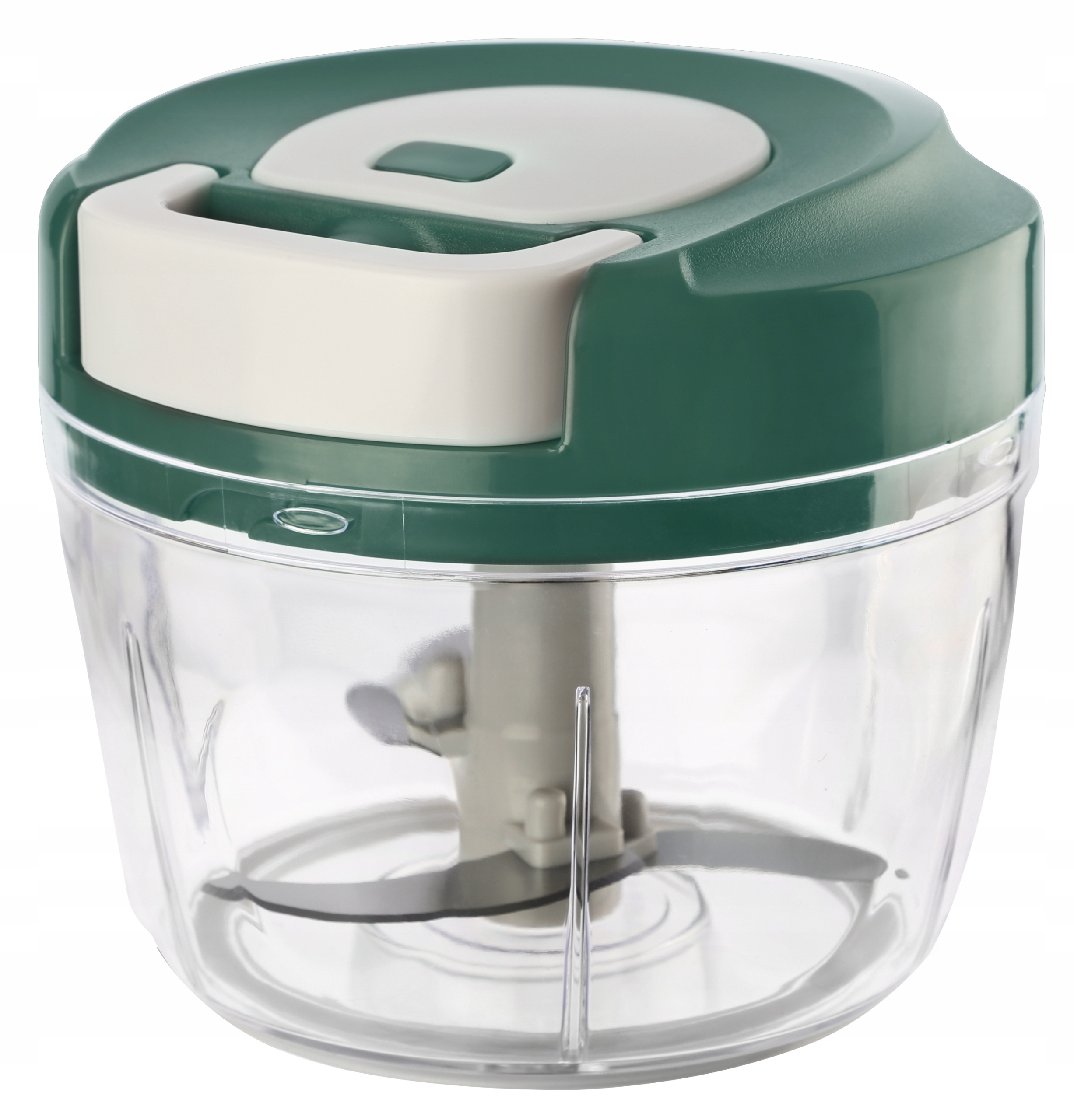 Прилад складається з прозорої пластикової чаші та щільної білої кришки зі зручною ручкою. Потягнувши за нього, ми активуємо струновий механізм, який дозволяє ефективно подрібнювати продукти, що поміщаються всередину.