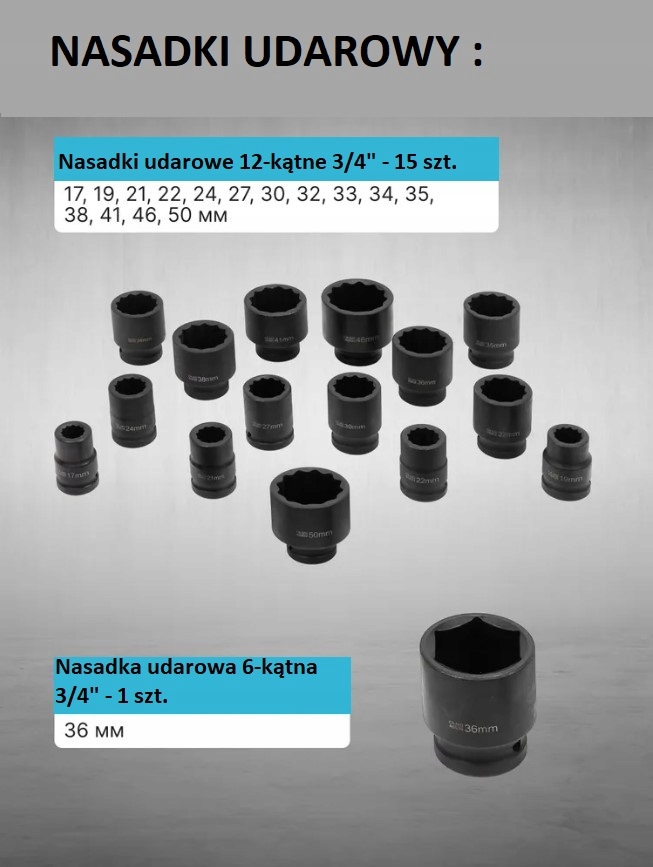 - Гнізда 12-точкові 3/4" - 16 шт. 17, 19, 21, 22, 24, 27, 30, 32 , 34, 35,36, (36 мм - 6 точок), 38 мм, 41 мм, 46 мм, 50 мм;
