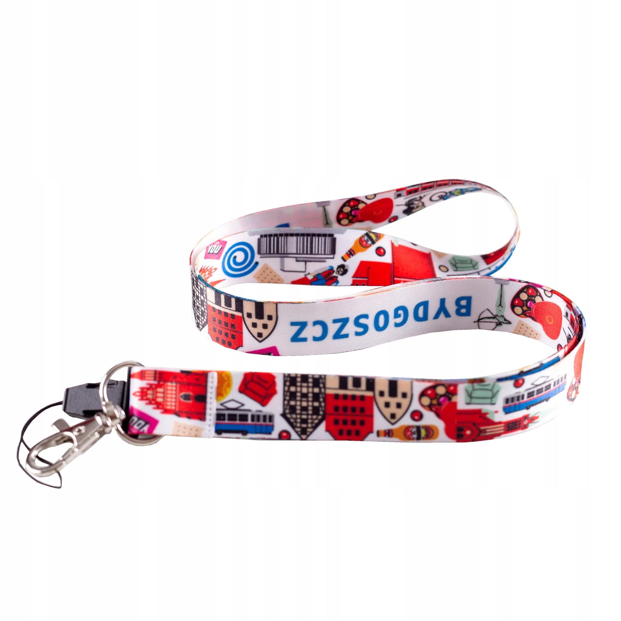 білий широкий повідок для телефону/клавіш із написом напису та візерунками, що представляють символи міста.