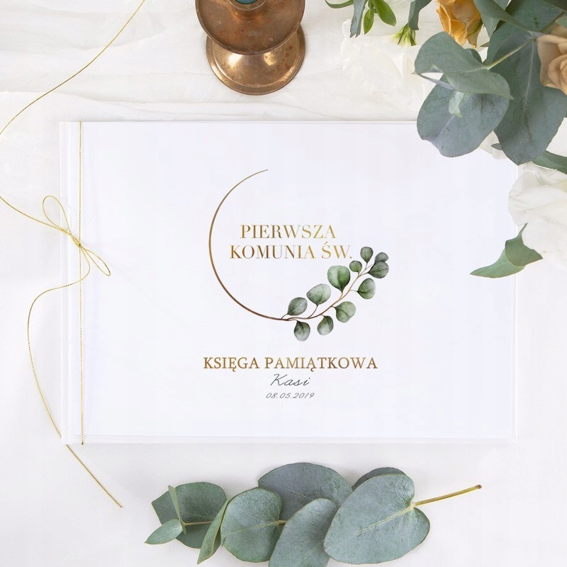 Колекція Eukaliptus — це красива та елегантна пропозиція для Святого Причастя в сучасному та мінімалістичному стилі. Причастя з гілкою евкаліпта виглядають надзвичайно свіжо і радують своїм неповторним стилем. Одним із аксесуарів на цей мотив є пам’ятна книга з іменною палітуркою, підготовлена до Першого Святого Причастя. За допомогою хроніки маленький герой цієї незвичайної неділі збере всі спогади про цей особливий день в одному місці.